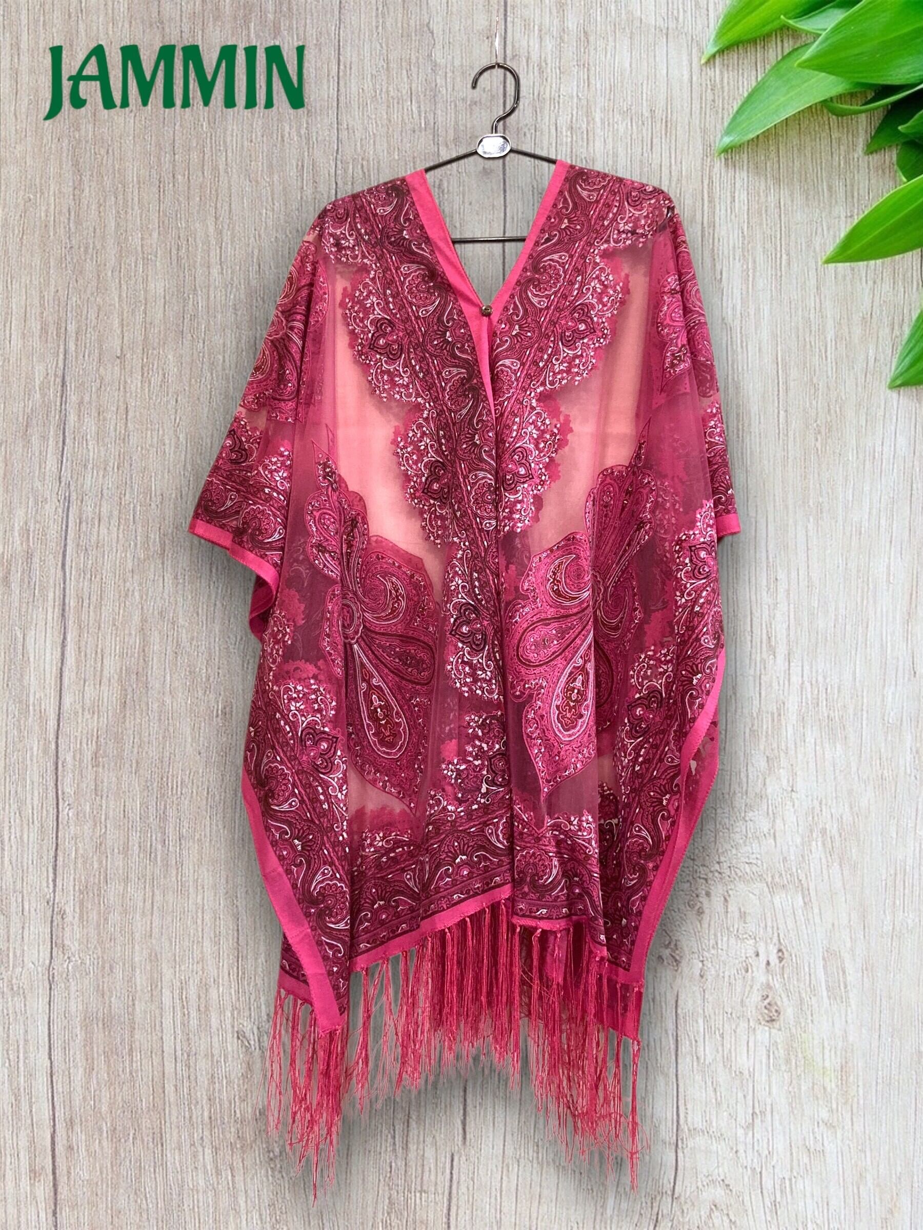 アジアンなペーズリー柄のフリンジ付きレーストップスです。