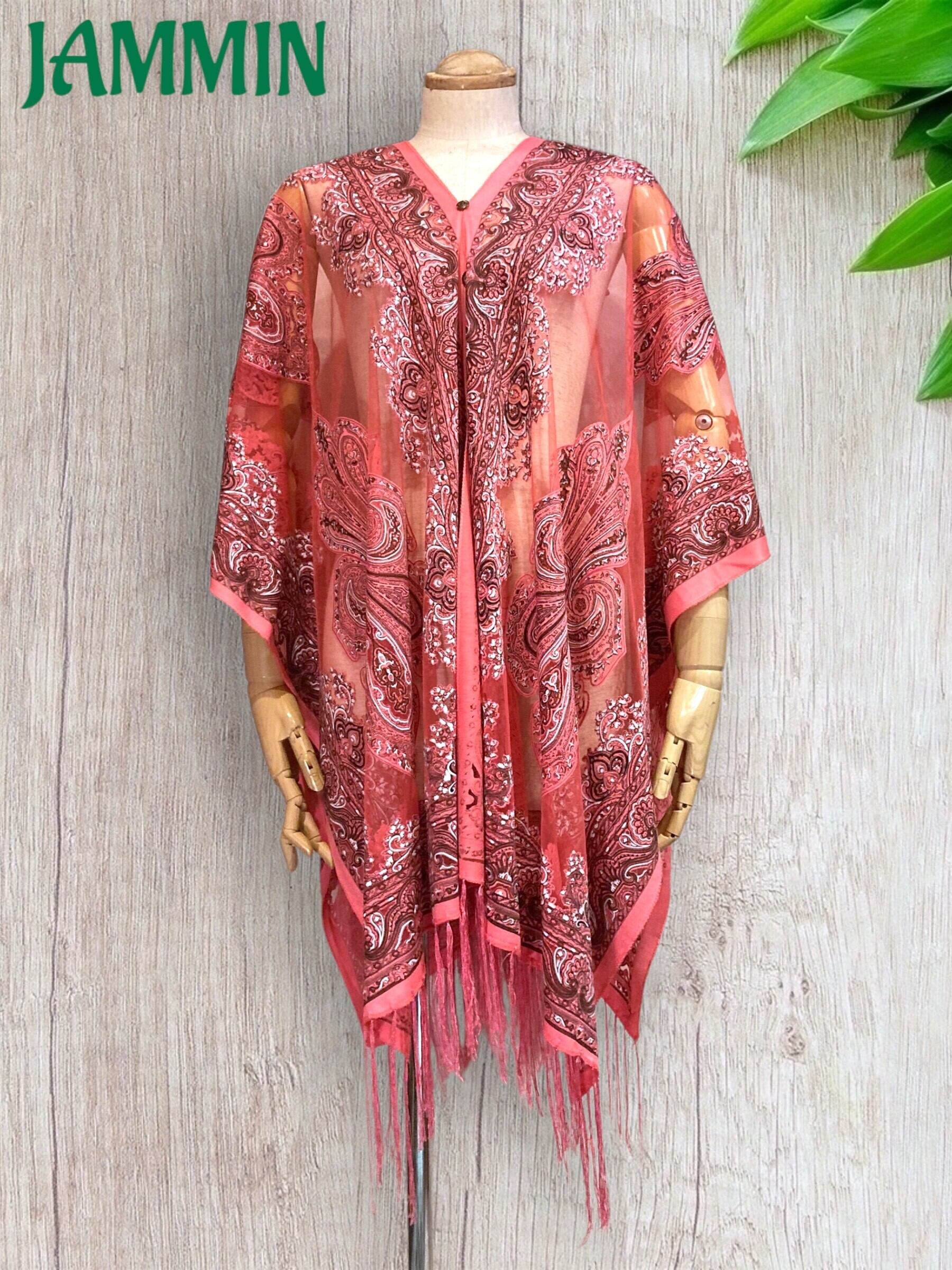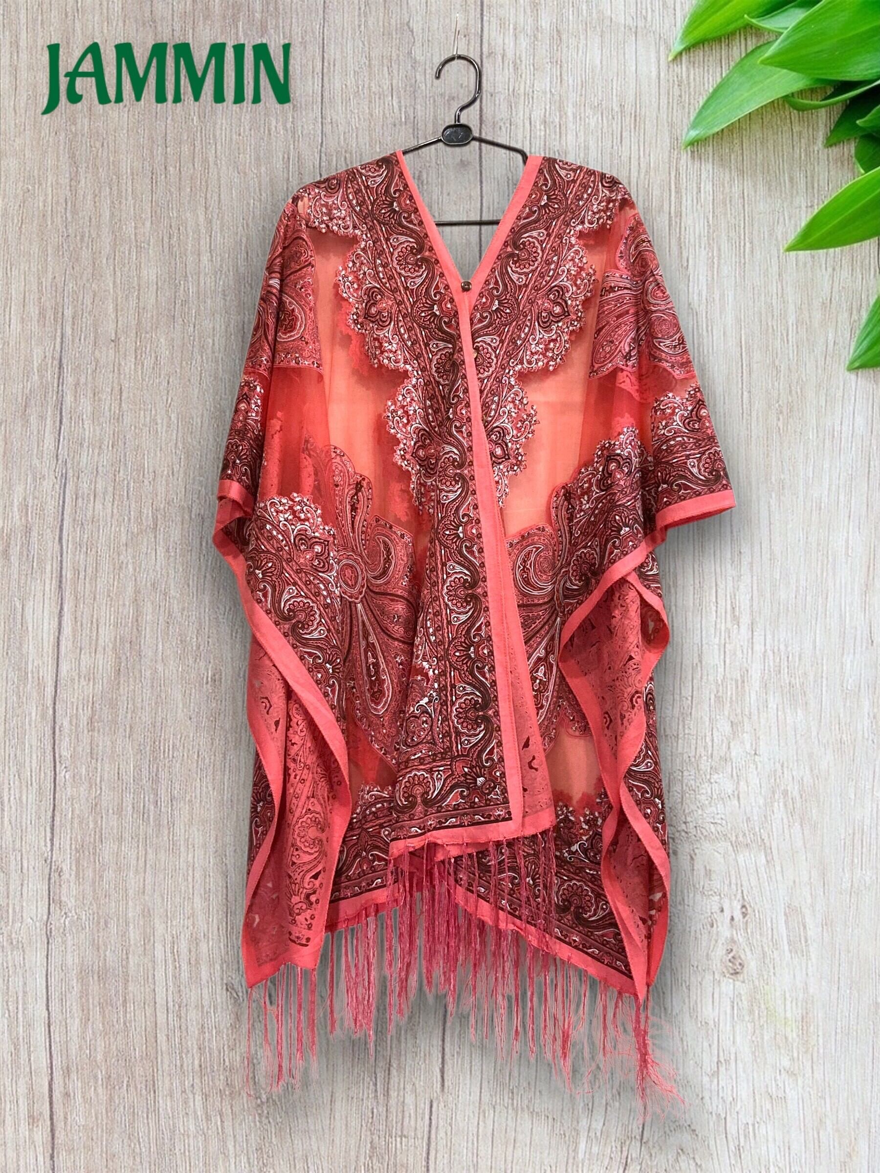 アジアンなペーズリー柄のフリンジ付きレーストップスです。
