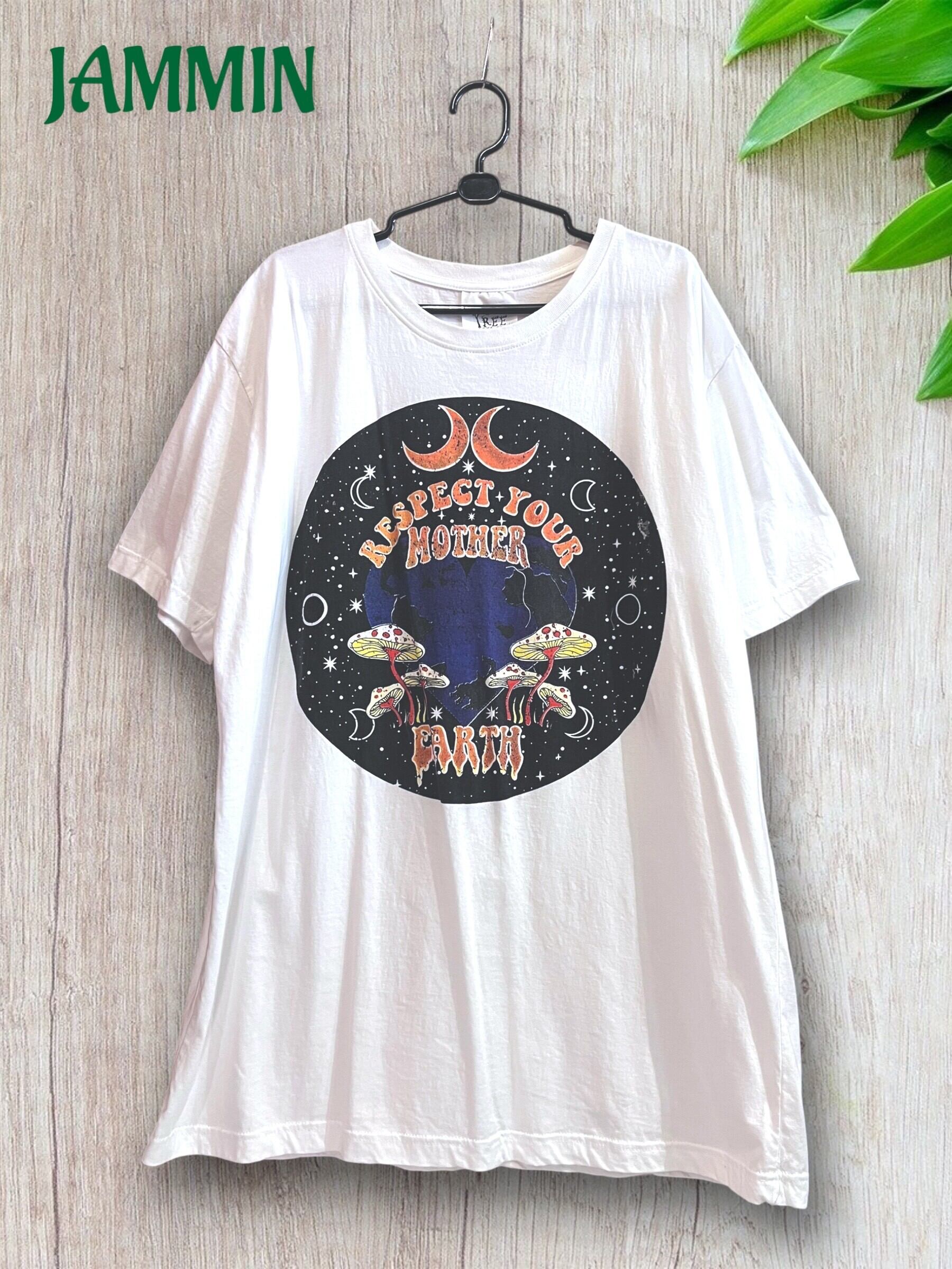 地球、キノコ、宇宙のプリント入りTシャツです。