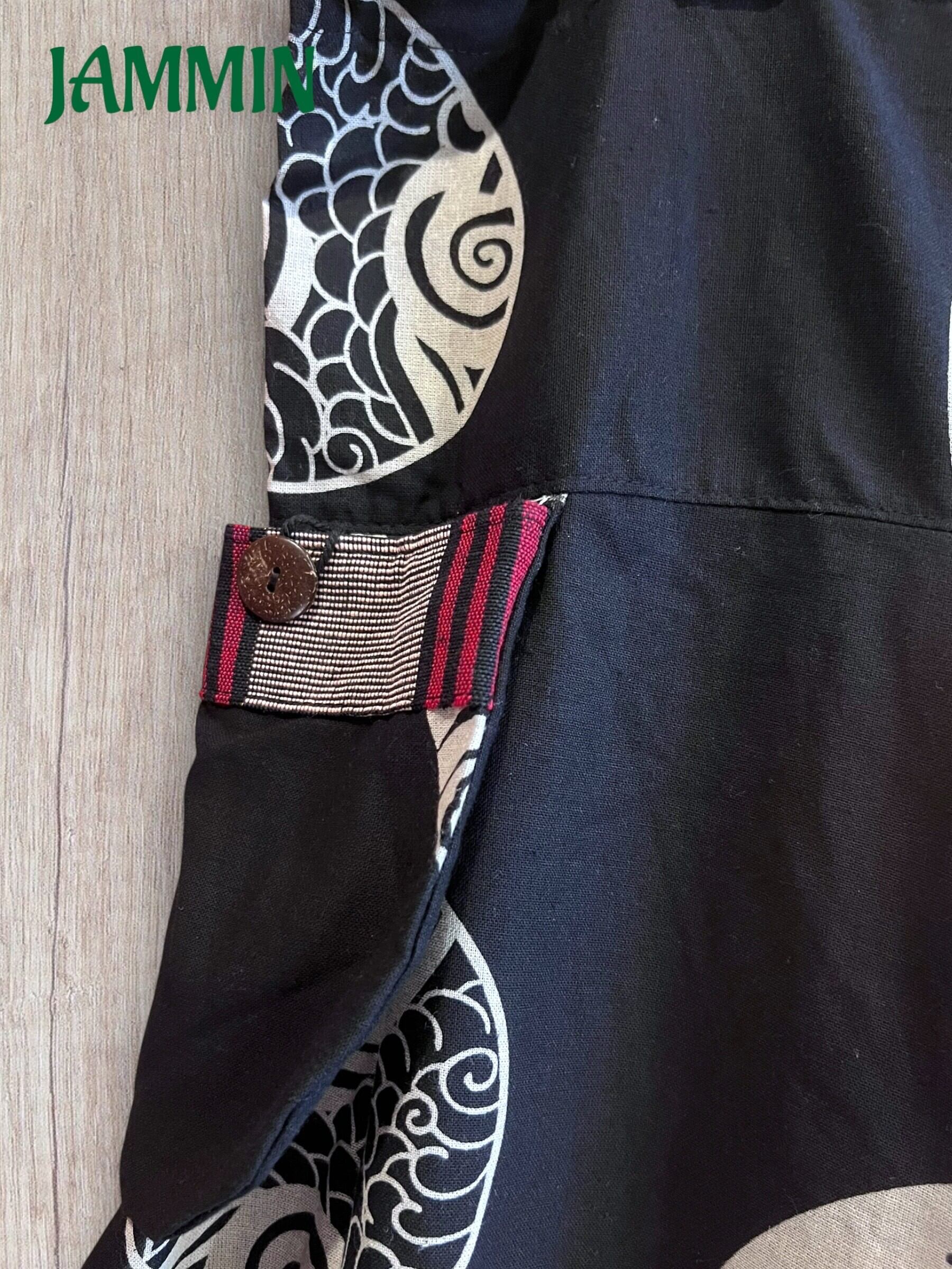 片ウエスト、ポケット口、裾にナガ族の織り生地が使われた和柄(太陽、雲)サルエル忍者パンツです。