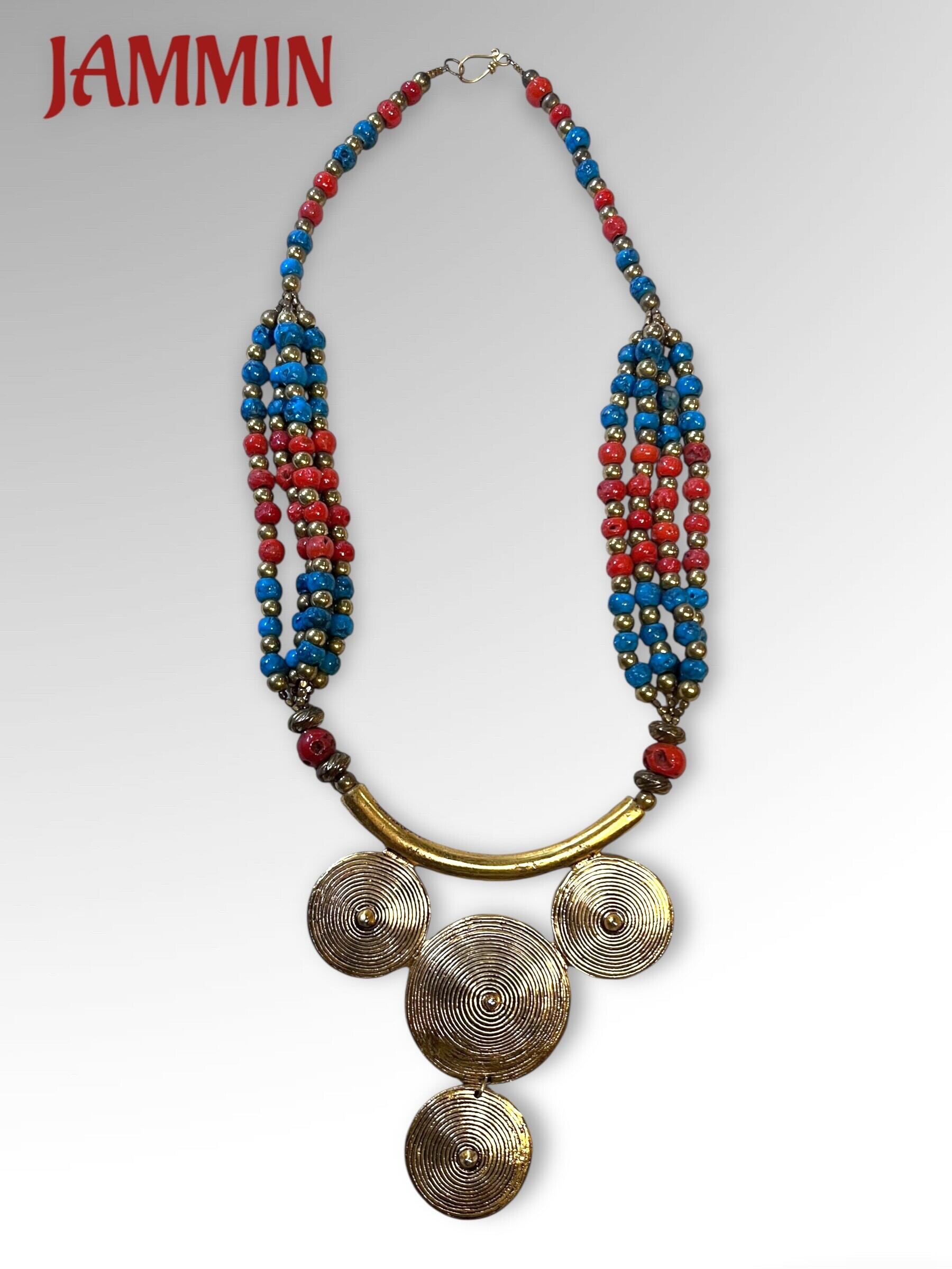 大きなぐるぐるパーツとブラスビーズなどを使った個性的なネックレスです。