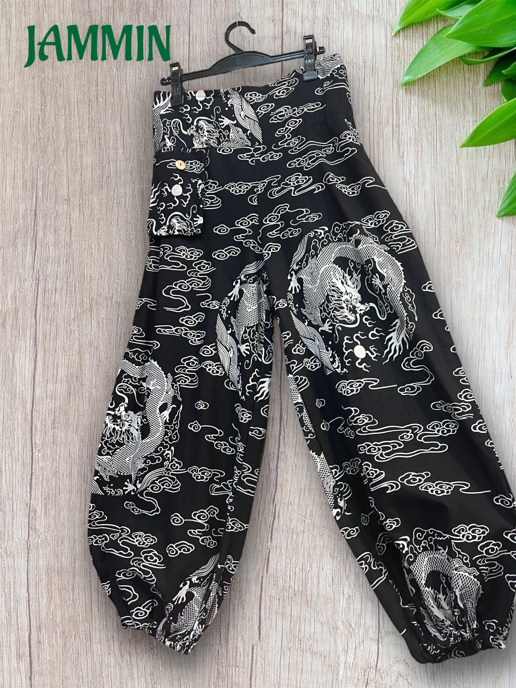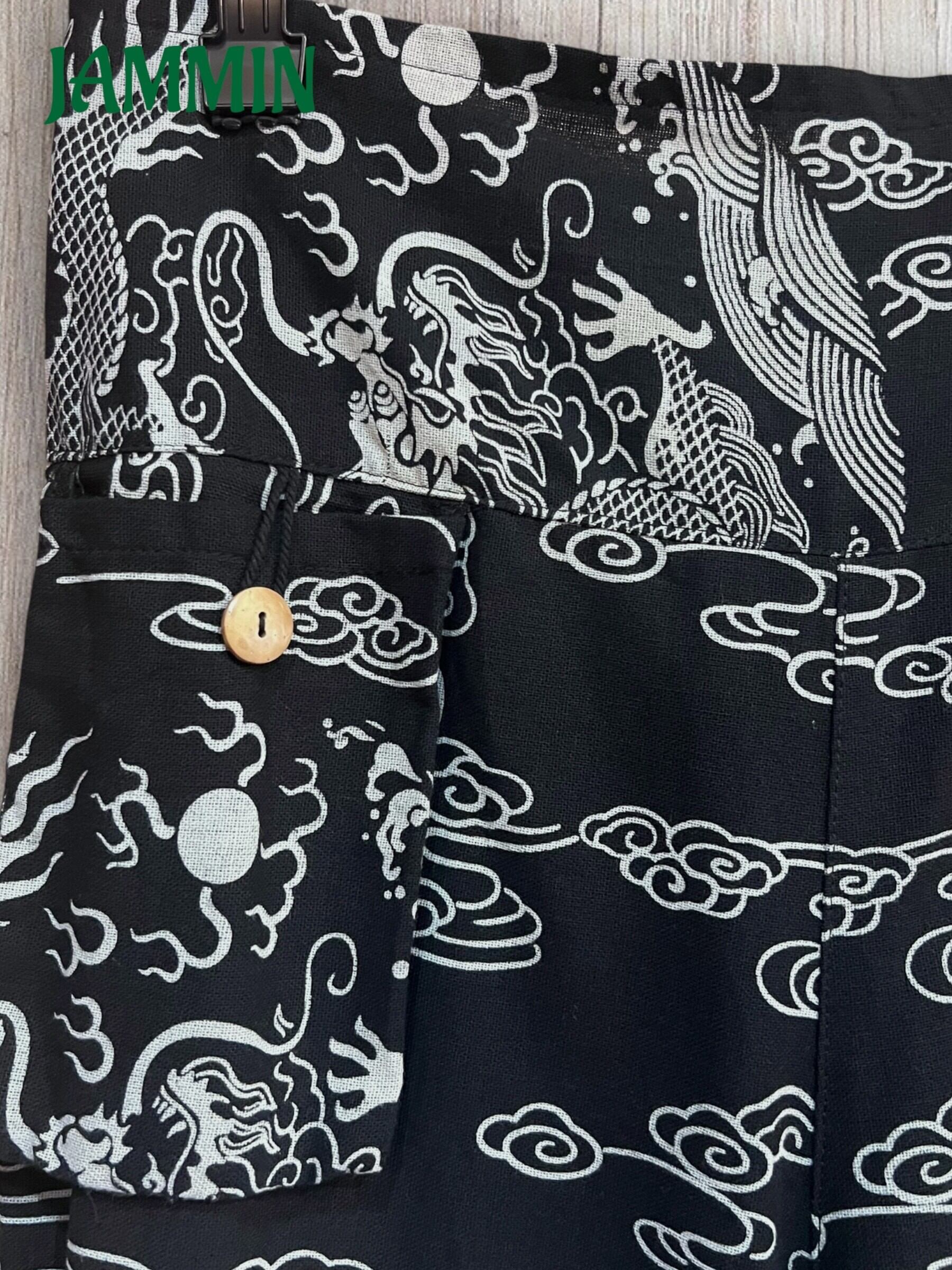 黒色ベースの和柄(龍、雲など)ゆるめパンツです。