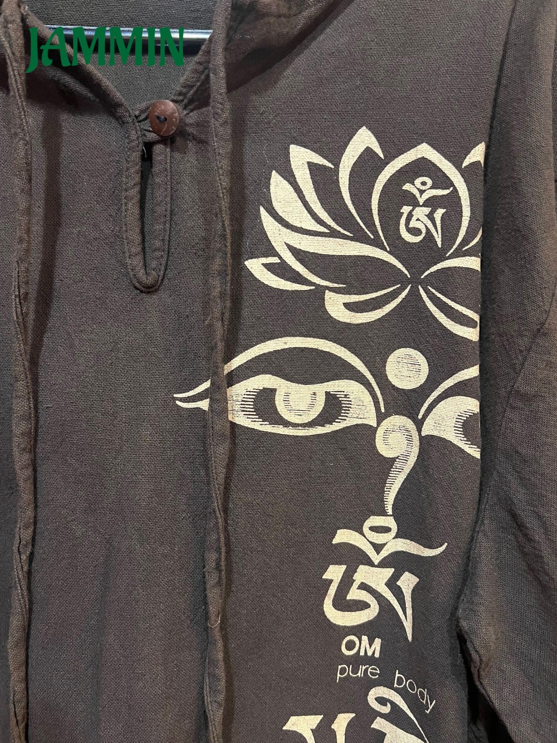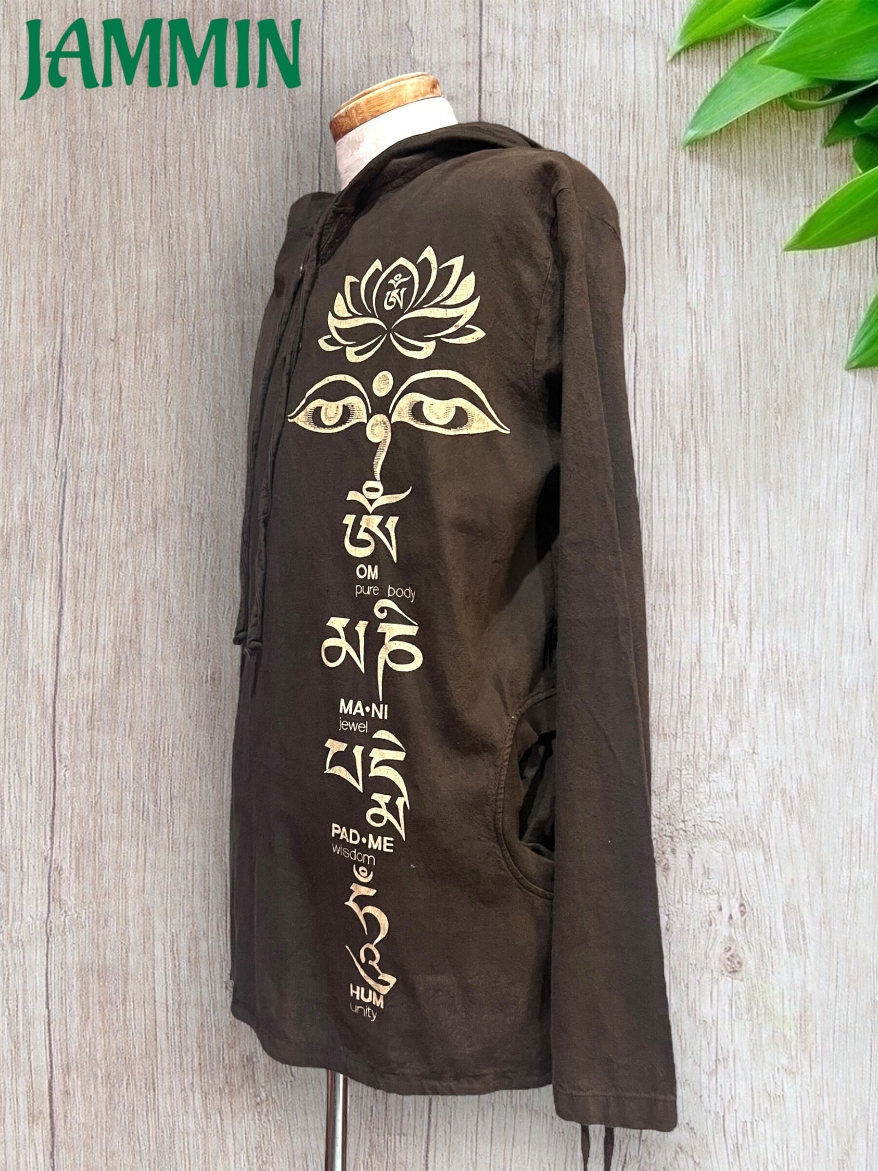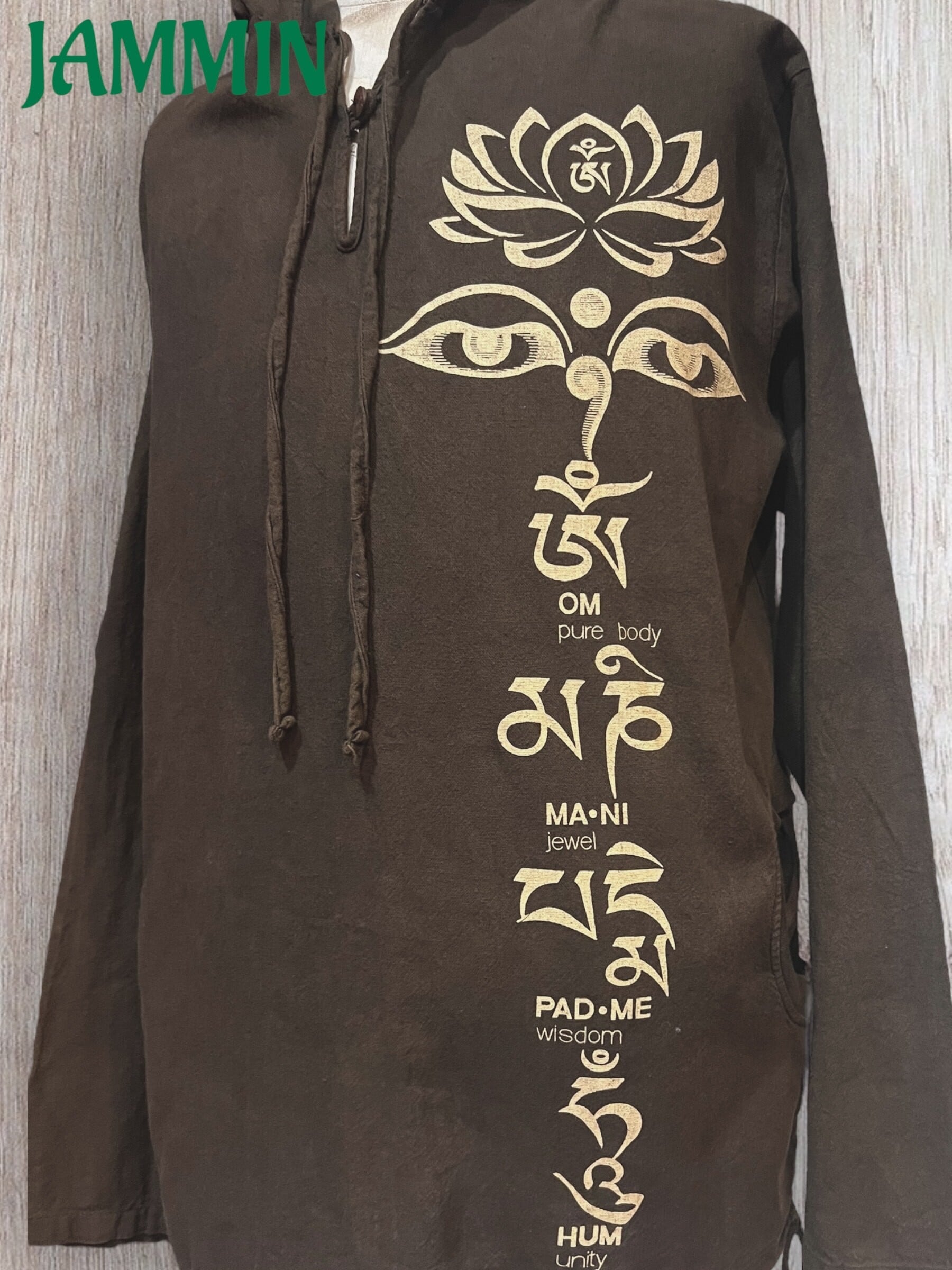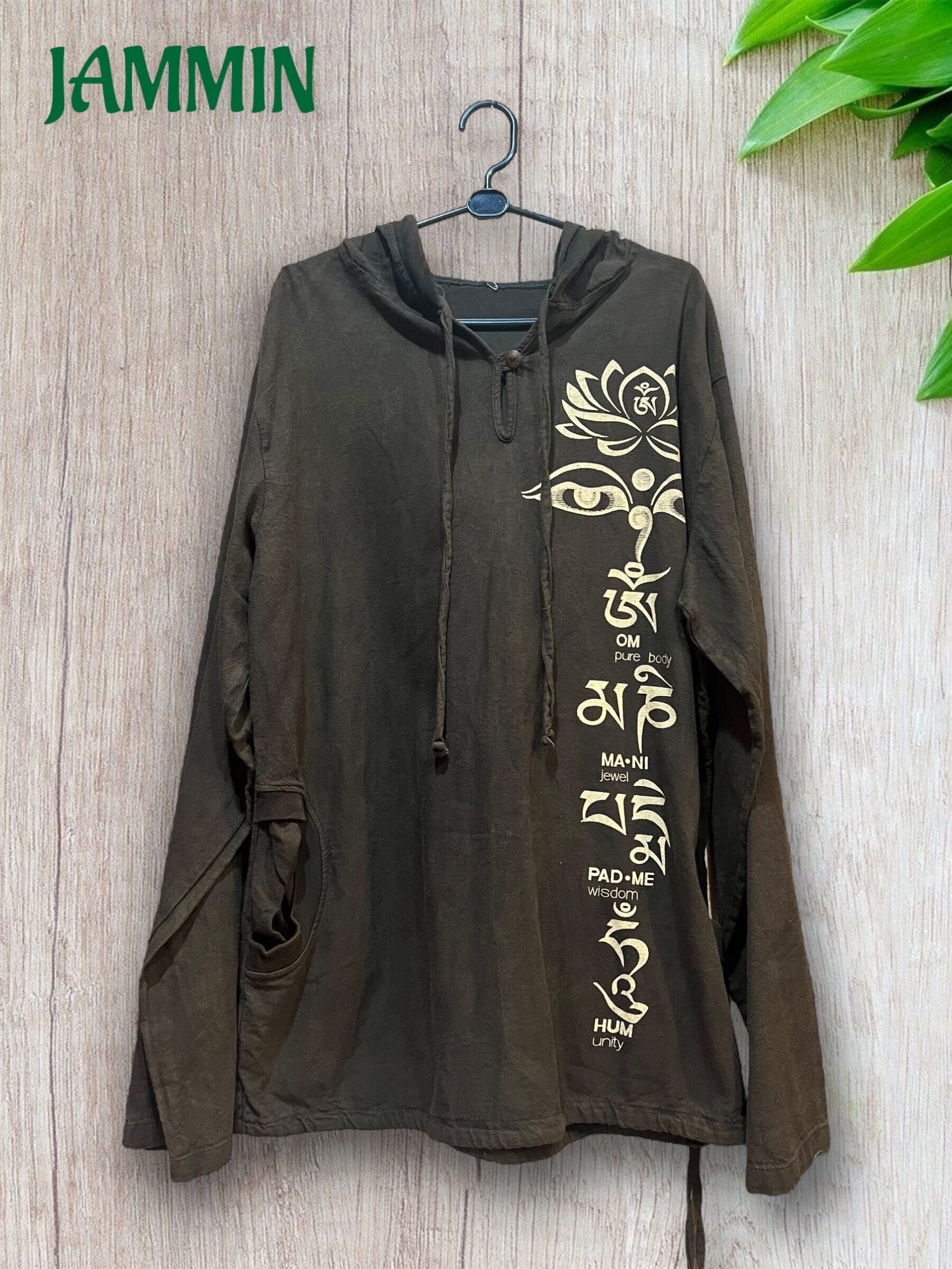 左脇にブッダアイとオム マニ ペメ フムの真言プリント入りのゆったりめプルオーバーパーカーです。