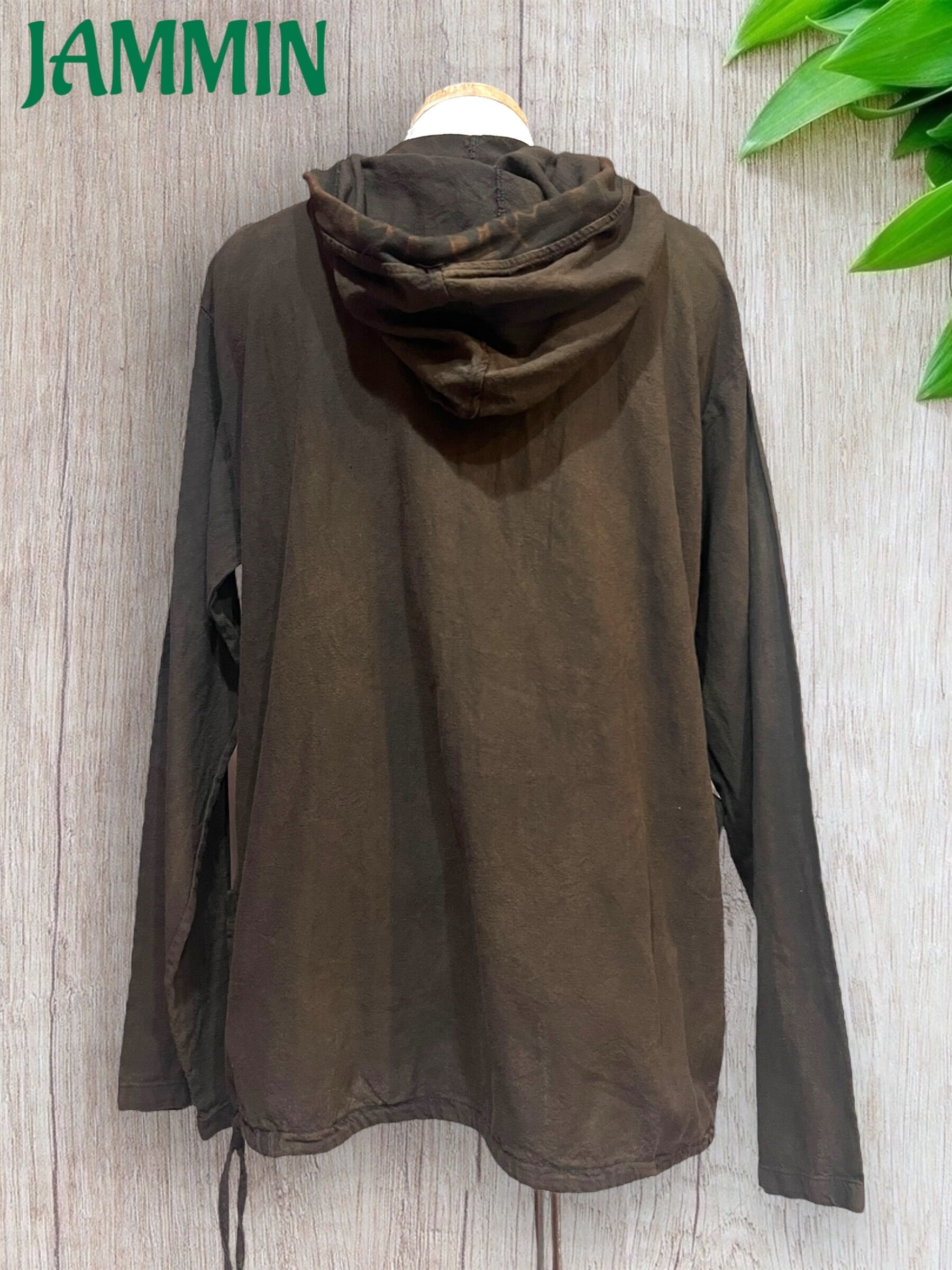 前首元にココナッツボタン付きで、フードと裾に紐入りです。