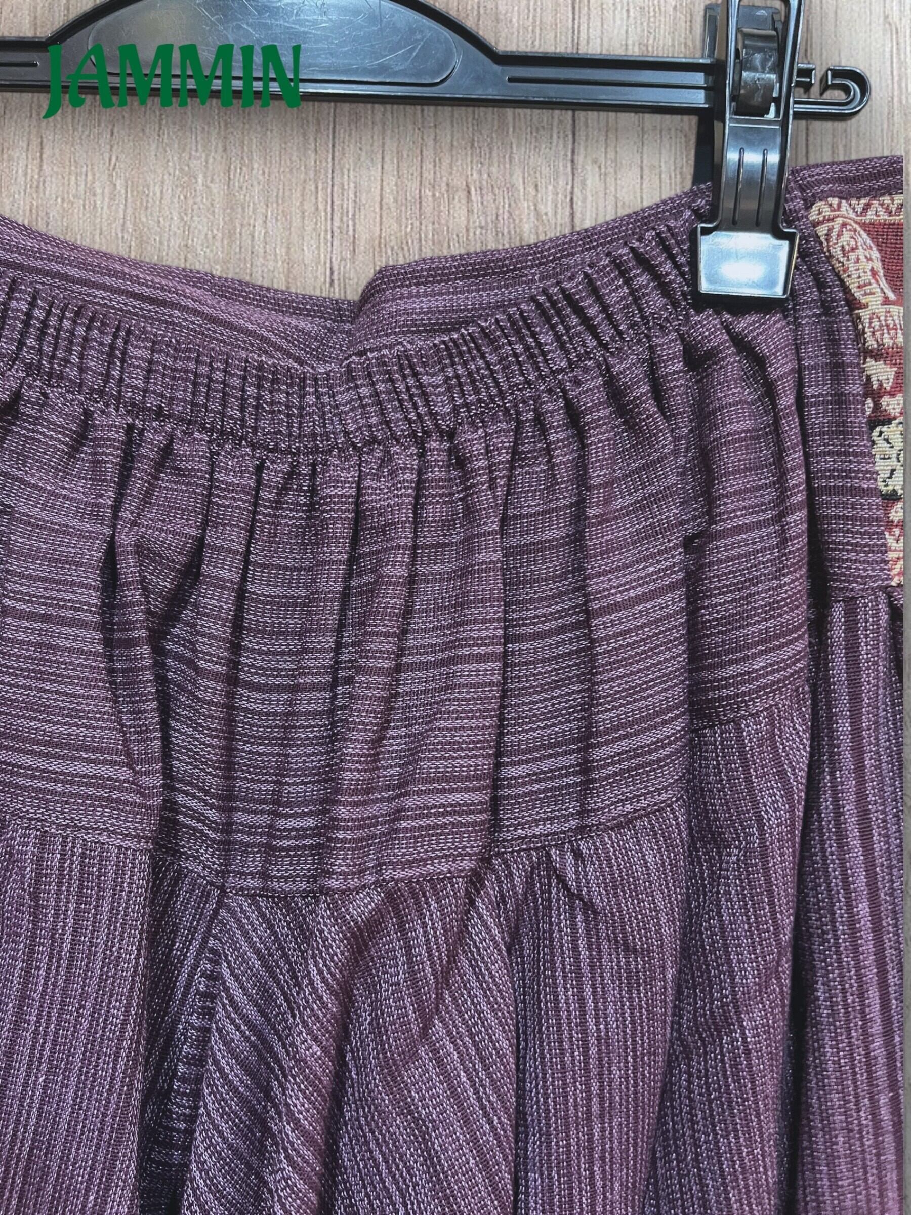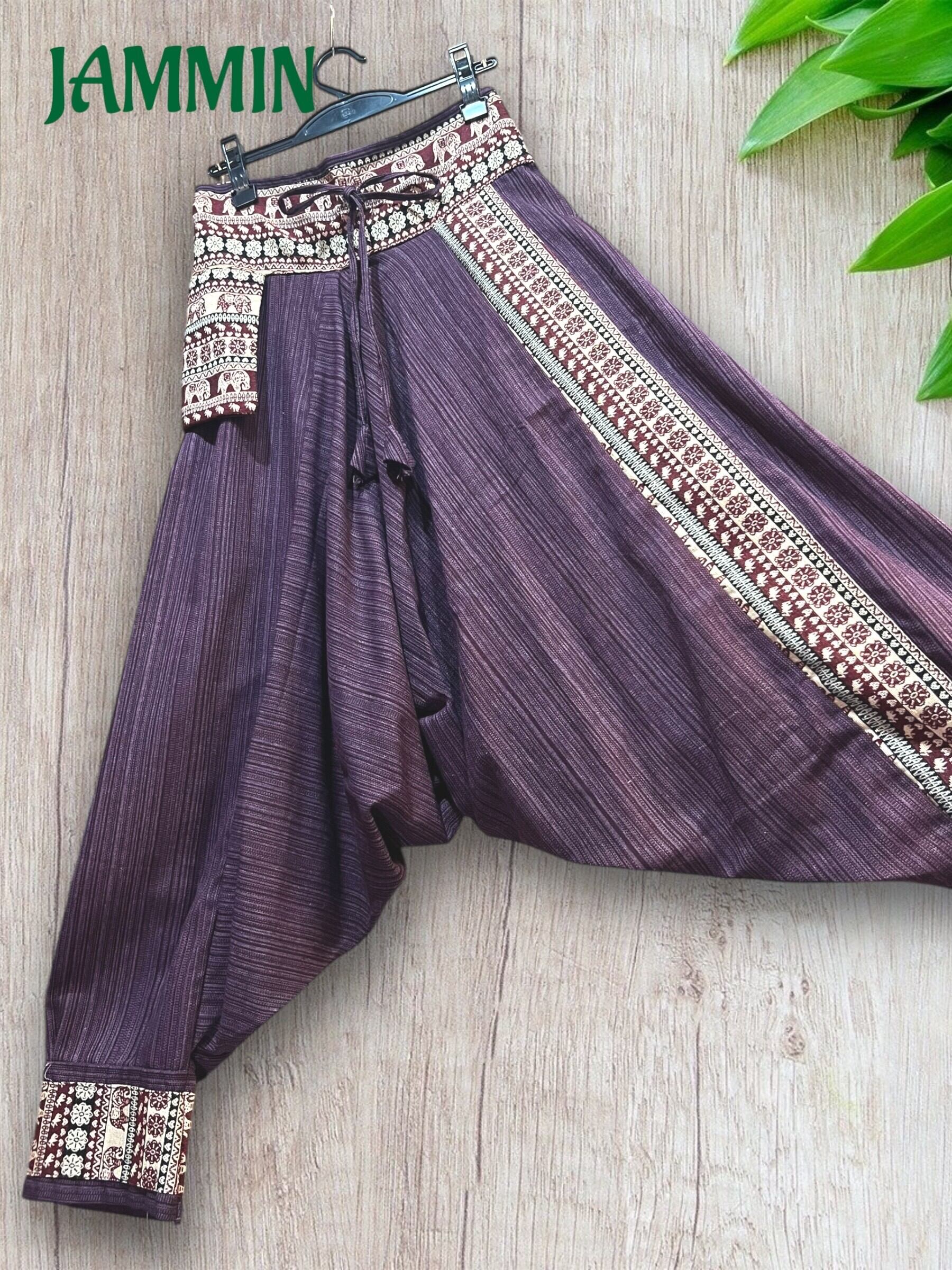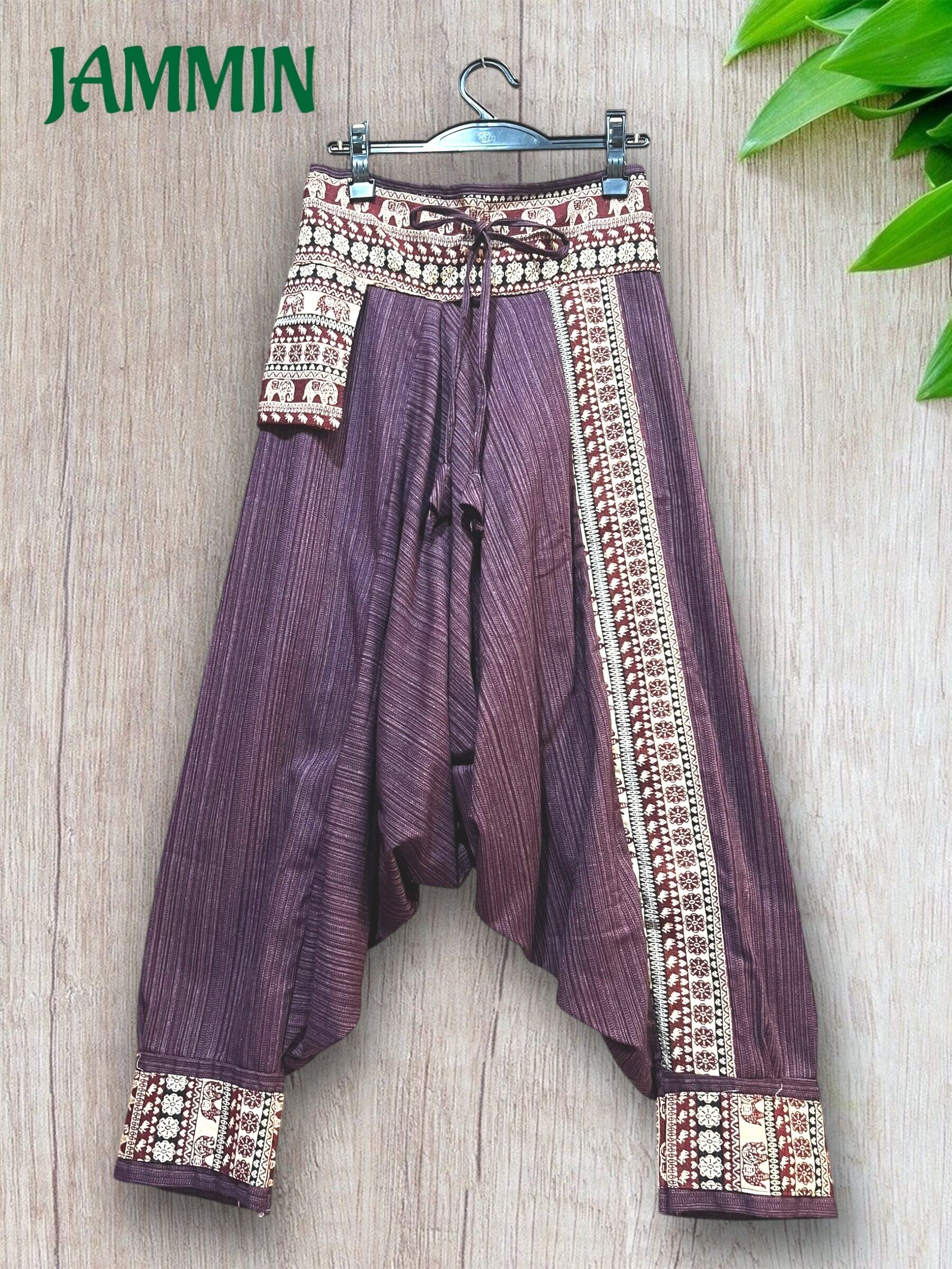 前ウエストと右前のポケット口、左前と裾にアジアンな織り柄生地付きのサルエルパンツです。