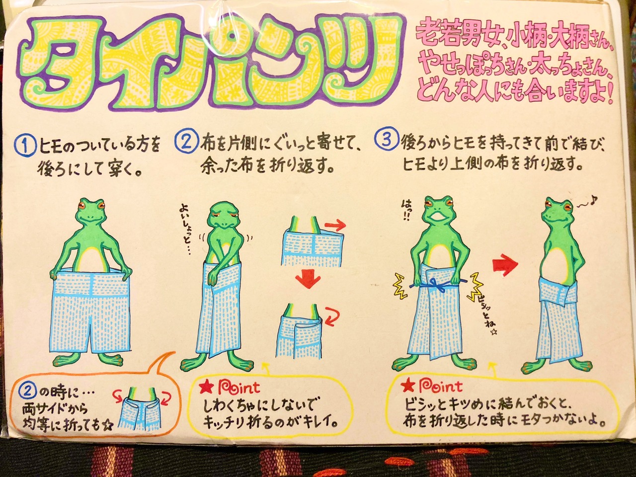紐部分を後ろにして足を通し、片端の余った部分を自由に折り畳んで紐で縛って着ます。