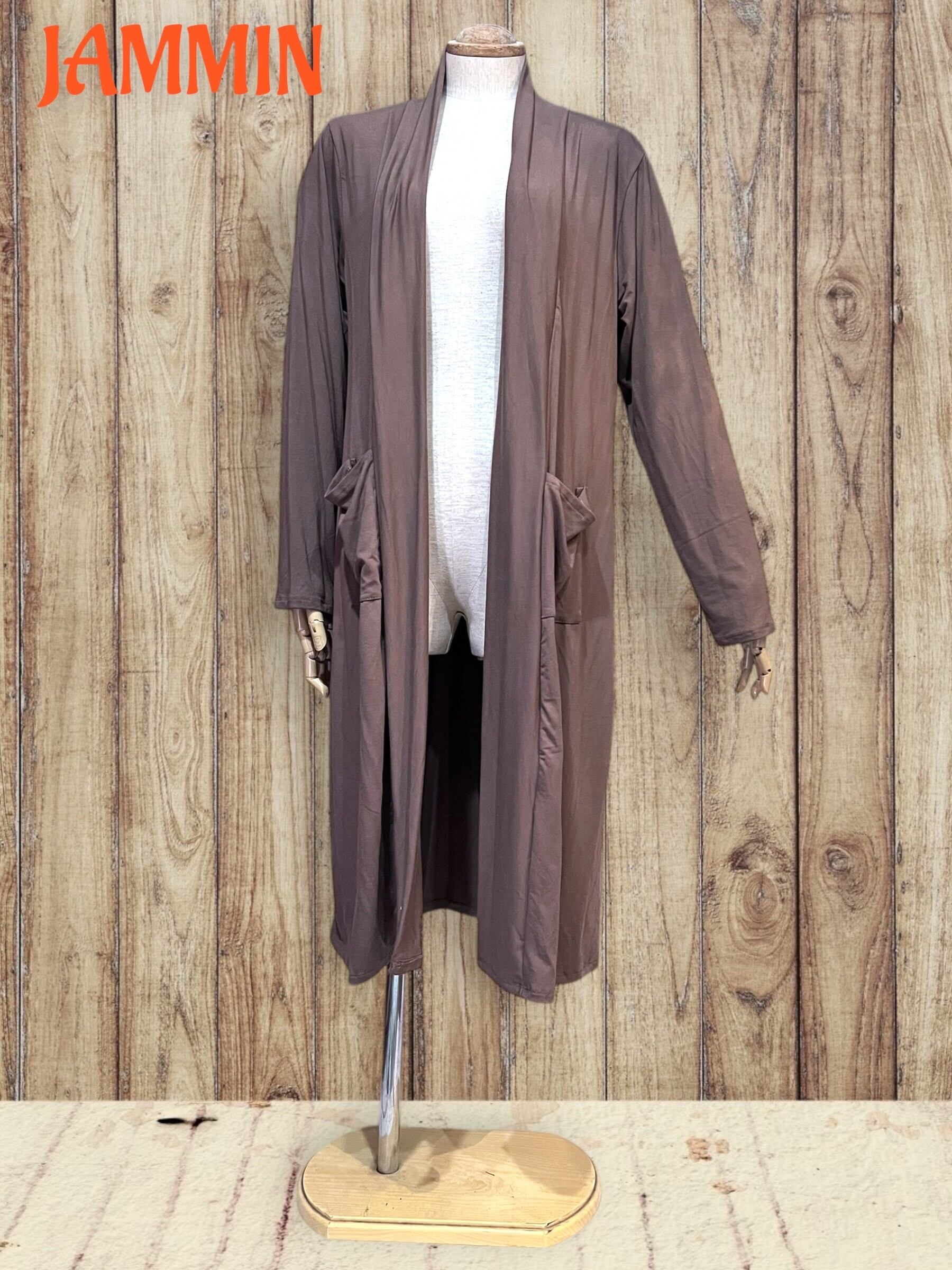 伸縮性に極めて優れたスパンデックス混のレーヨン素材で、着心地楽々のストレッチロングカーディガンです。