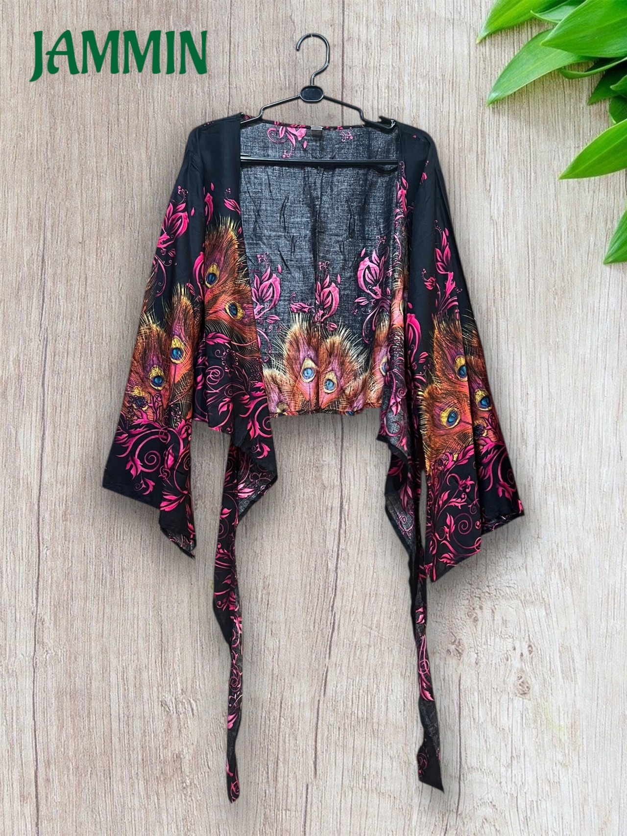 広めのフレア袖で、シルエットの可愛い孔雀羽根柄ボレロです。