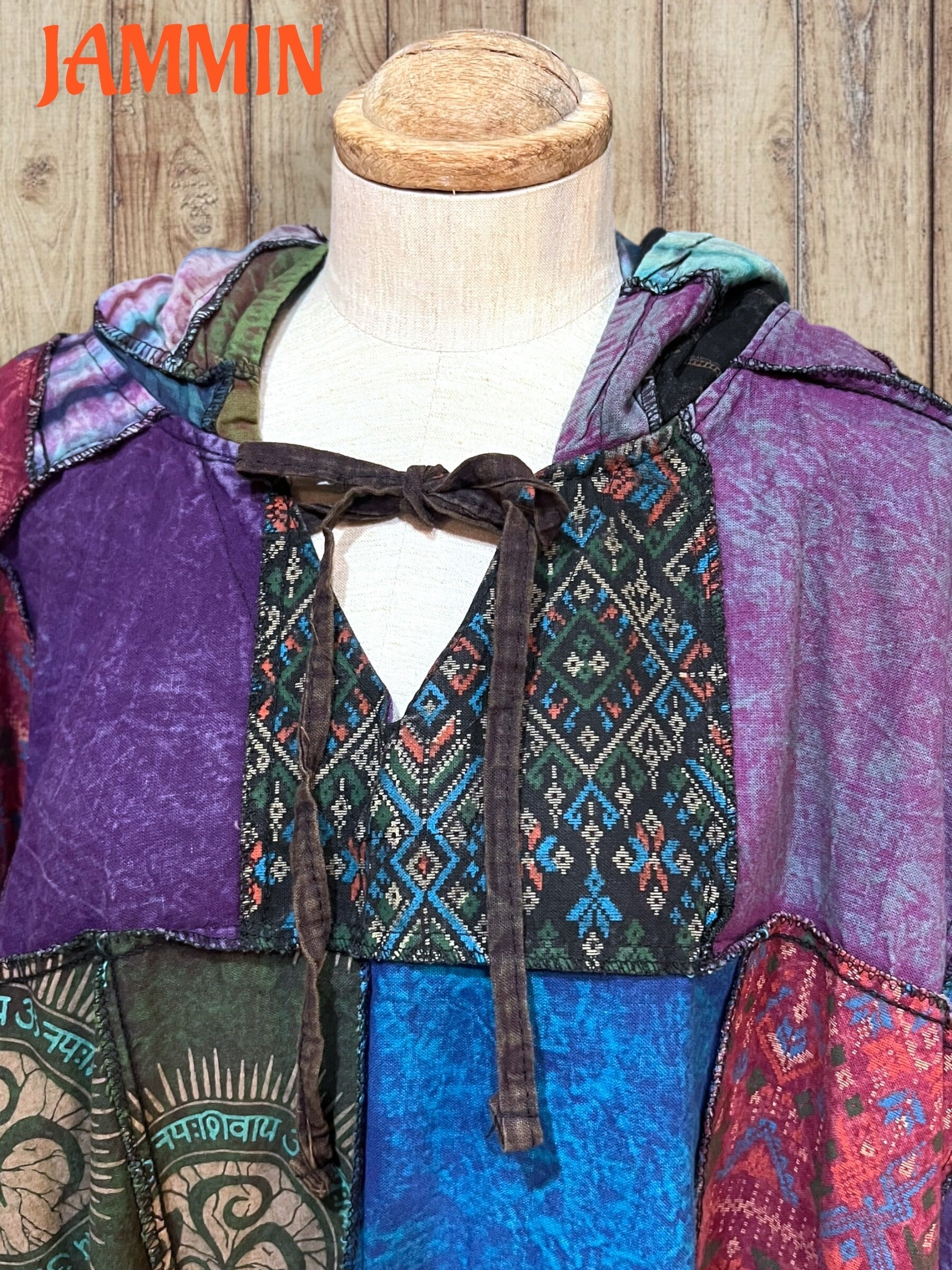 色々な柄生地(オーム、ヒンディ語、植物、タイダイ、モン族刺繍柄など)を使ったパッチワークフリンジポンチョです。