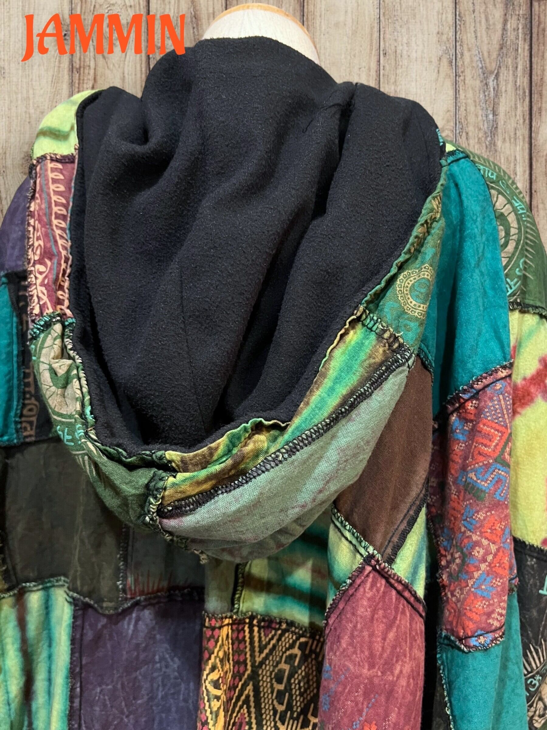 色々な柄生地(オーム、ヒンディ語、植物、タイダイ、モン族刺繍柄など)を使ったパッチワークフリンジポンチョです。
