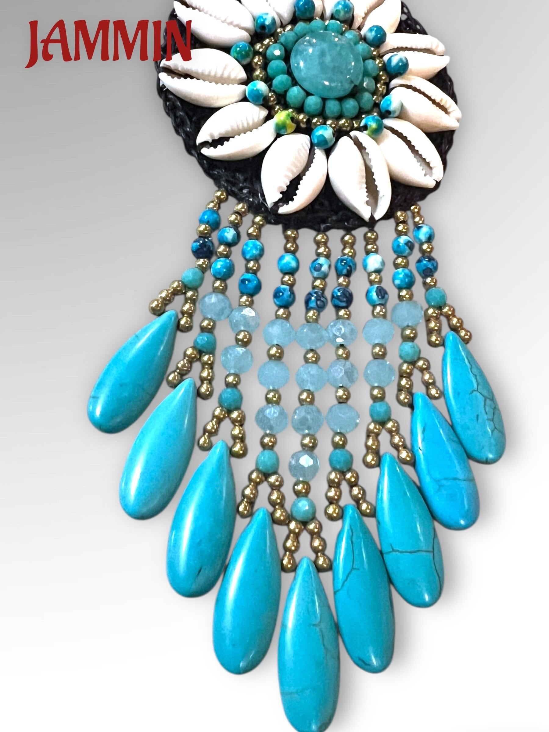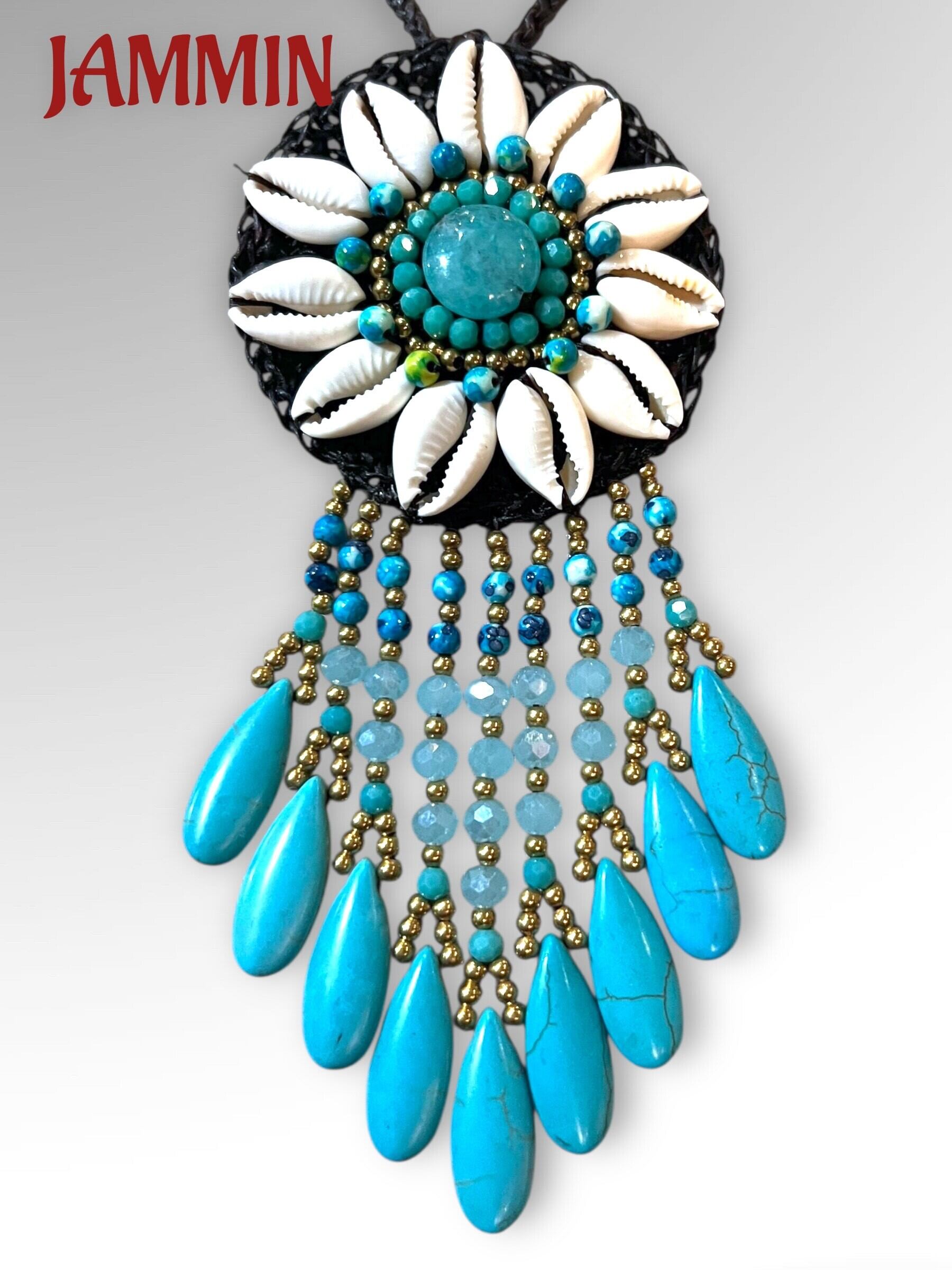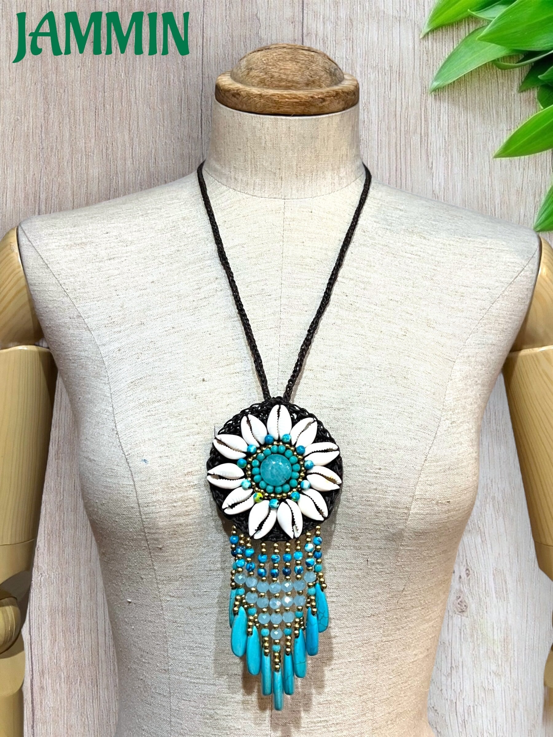 シェル(宝貝)やストーンビーズ、ブラスビーズ、ハウライトターコイズなどを使った太陽ネックレスです。