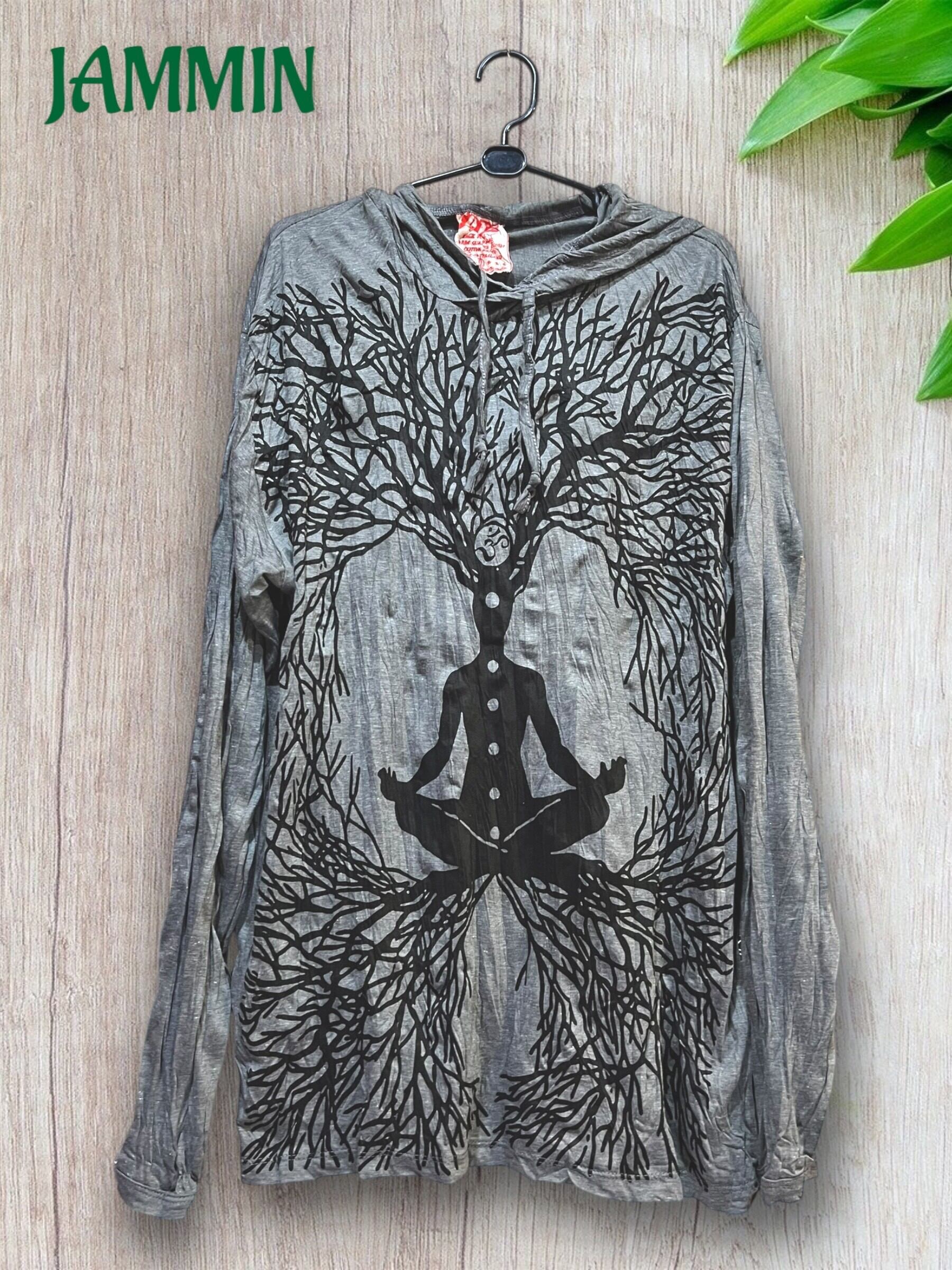 アジアン/エスニック/サイケ/ヒッピー/個性派/ロンT/長袖/Tシャツ/ロングスリーブTシャツ/フード付き/長袖/Lサイズ/チャクラ/瞑想/ヨガ