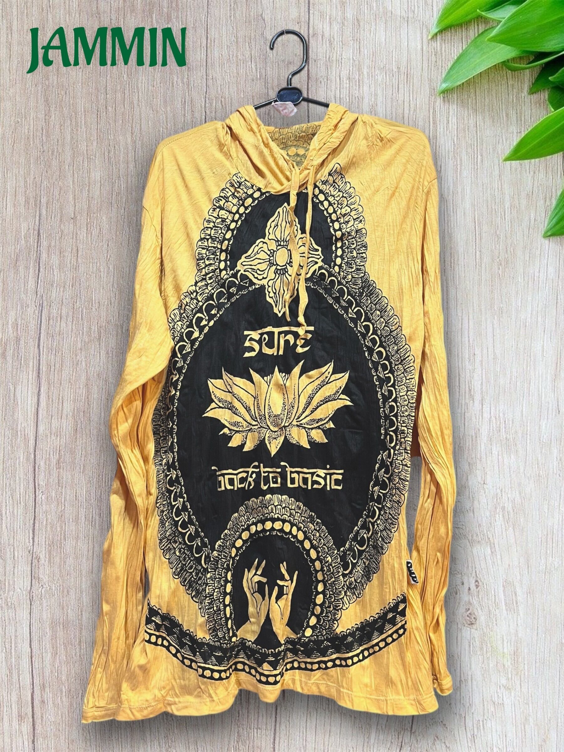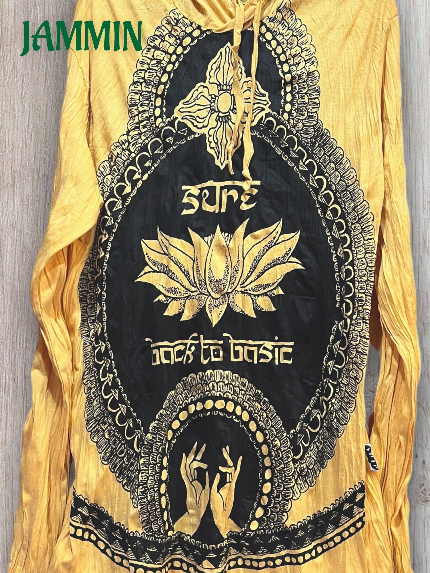 ロータスやダブルドルジェ、仏陀ハンドなどのプリント入りのフード付きロンTです。