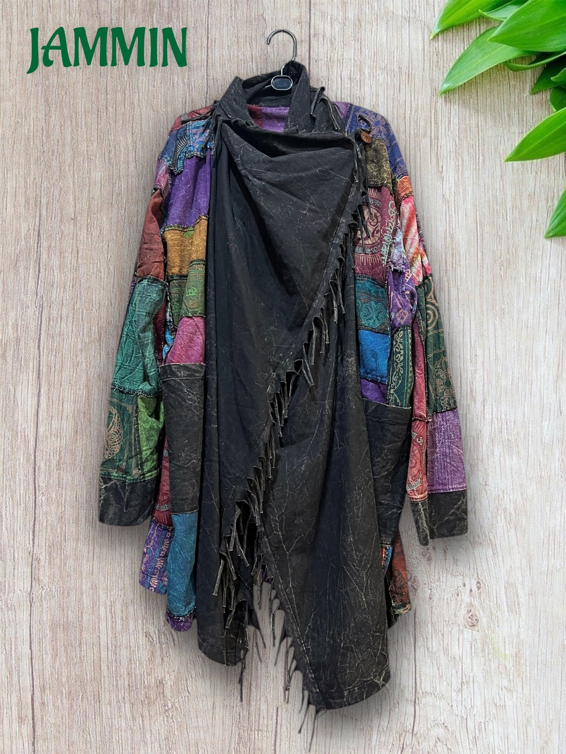 ゆったりざっくりしたデザインのパッチワーク旅人風ジャケットです。