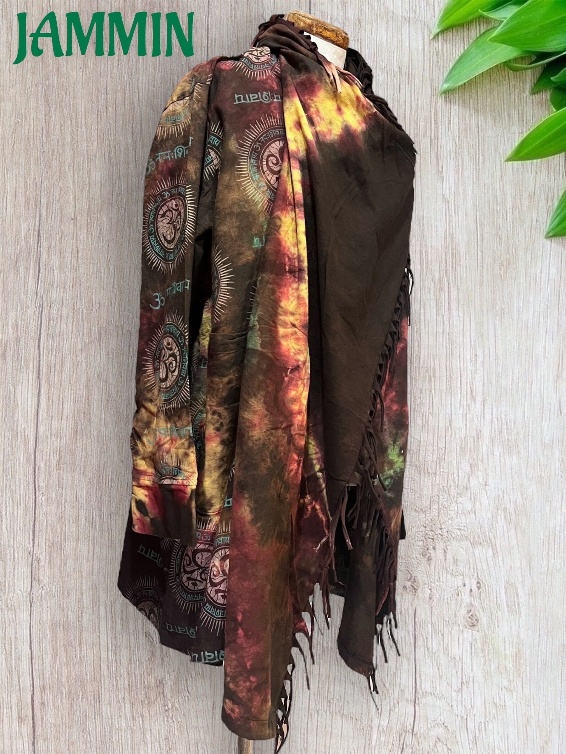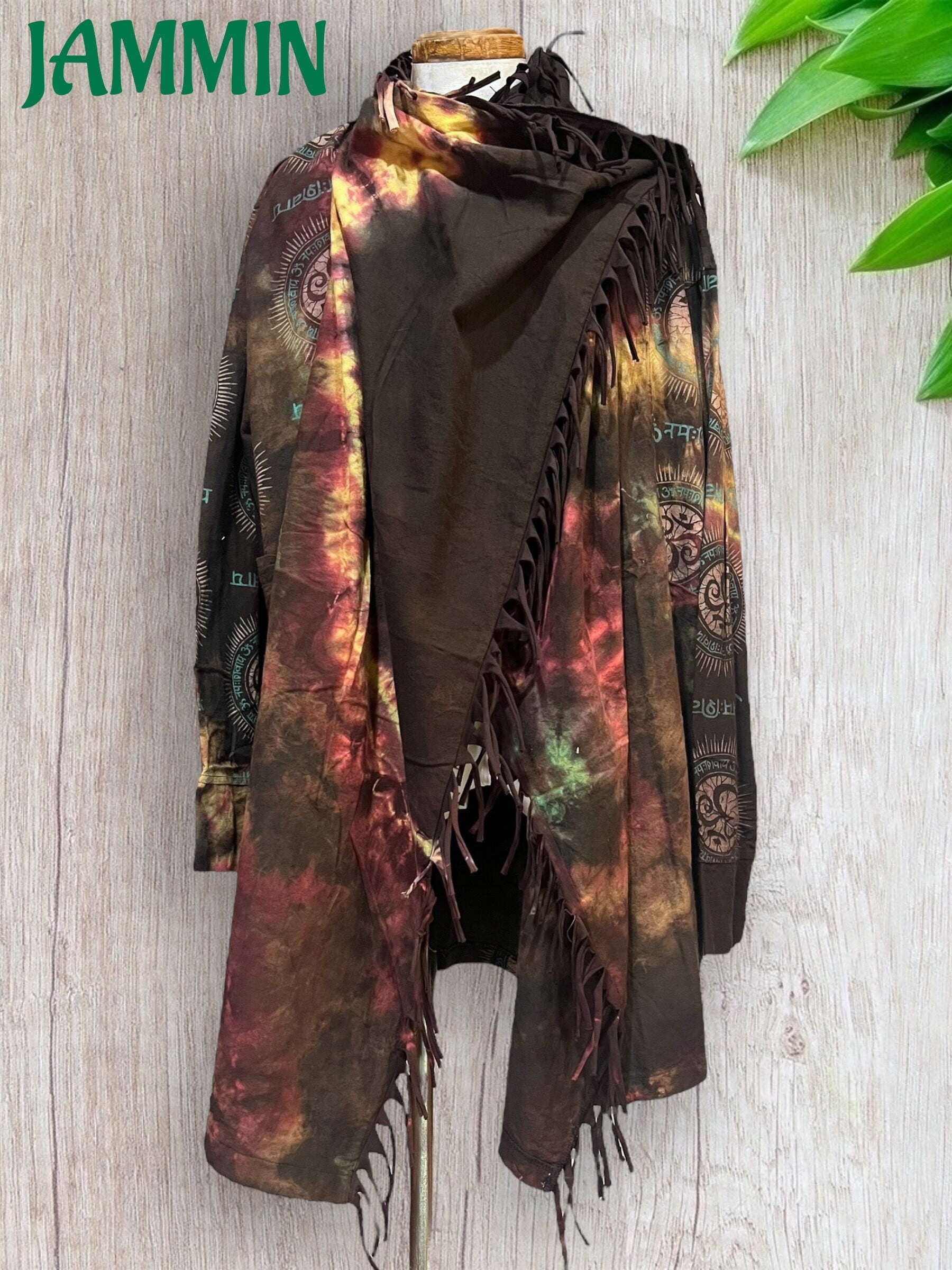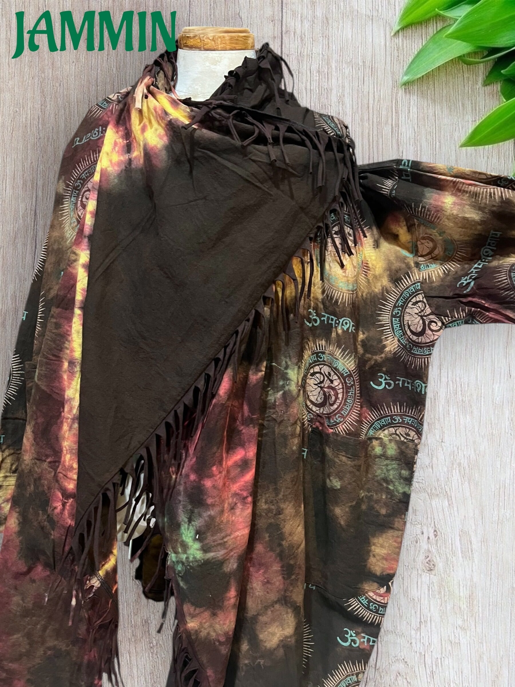 ゆったりざっくりしたデザインのアジアン柄(オーム、ヒンディ語)タイダイ旅人風ジャケットです。