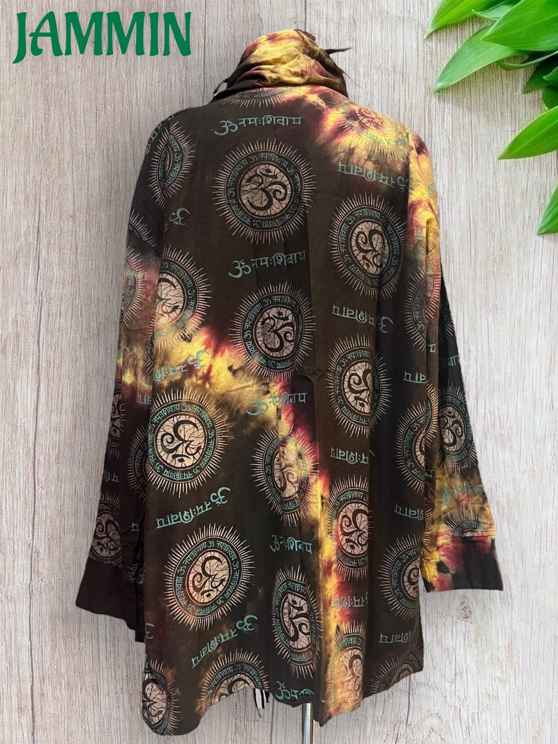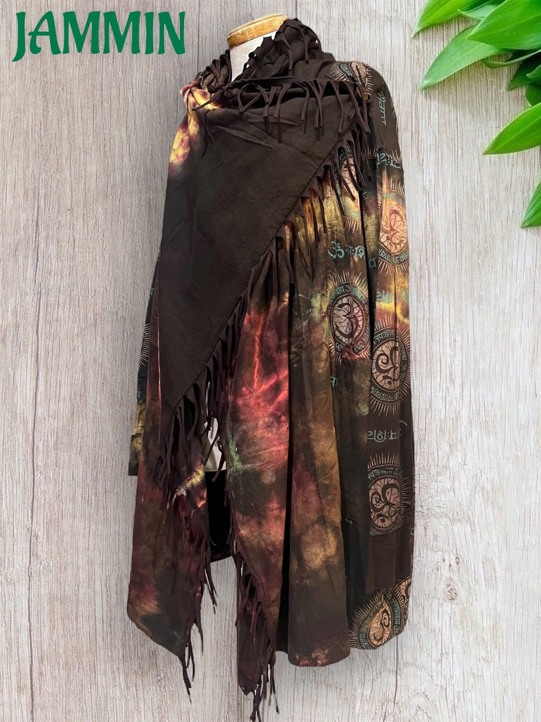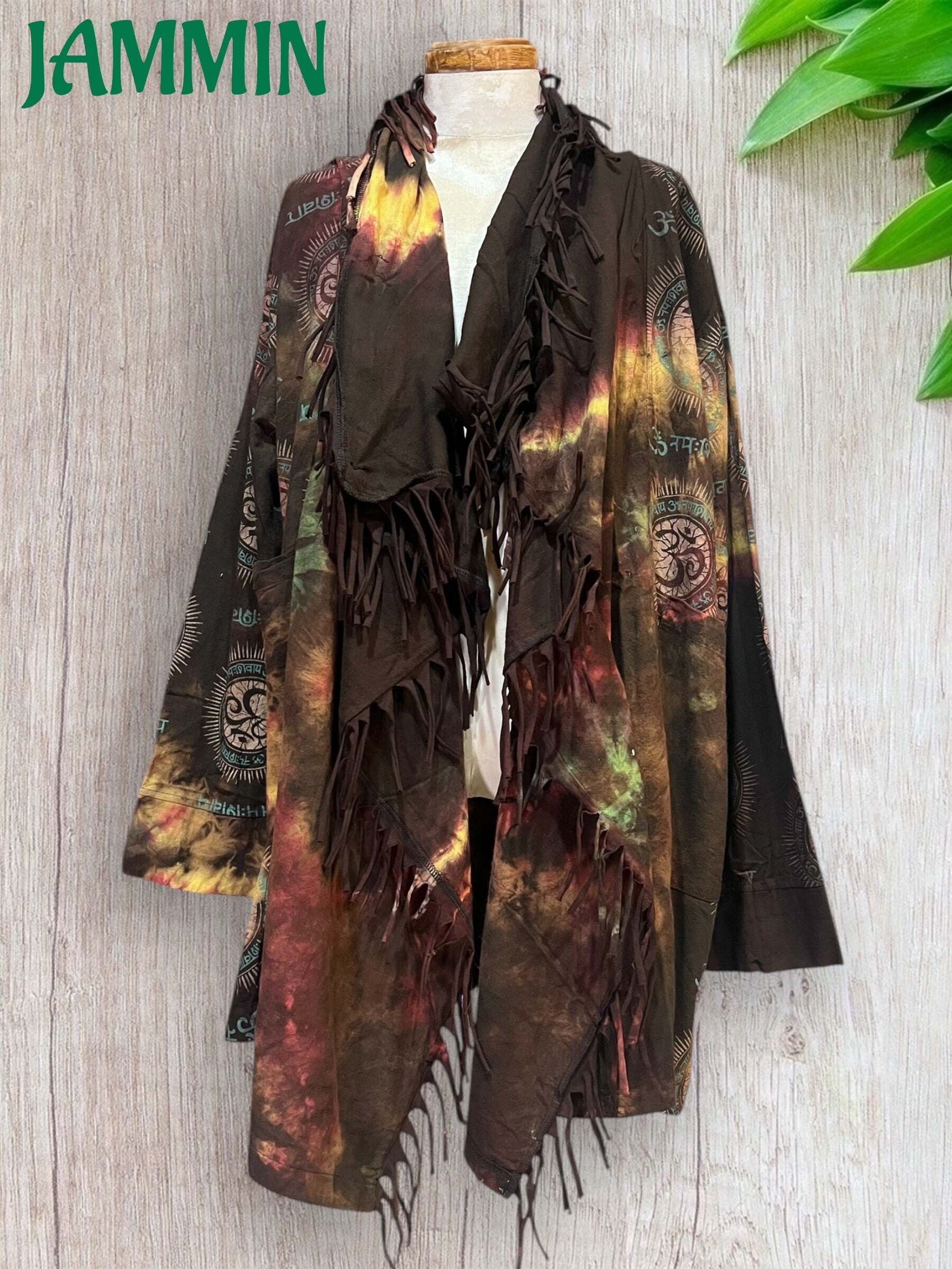 ゆったりざっくりしたデザインのアジアン柄(オーム、ヒンディ語)タイダイ旅人風ジャケットです。