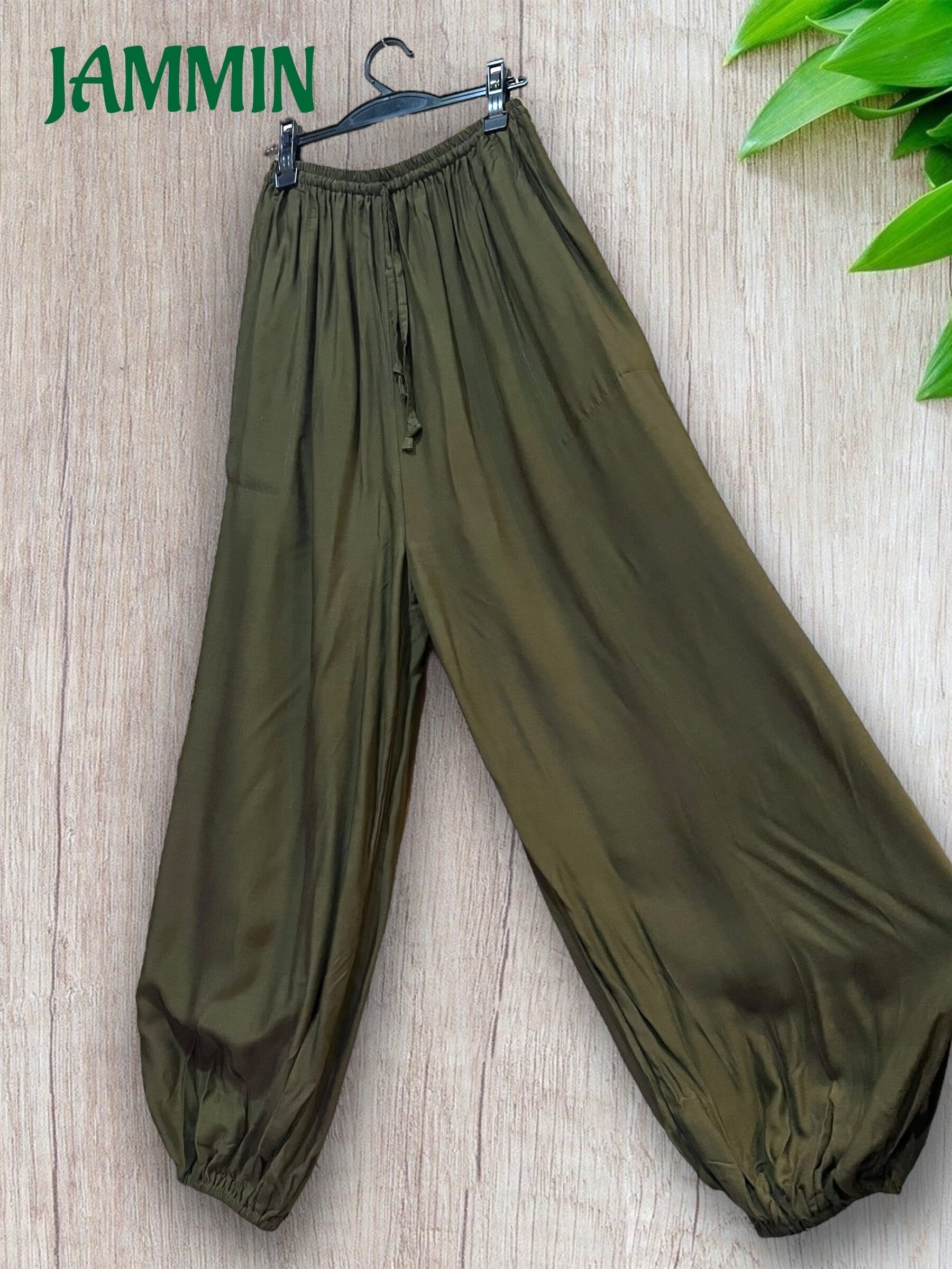 ゆったりサイズのカーキ無地アラジンパンツです。