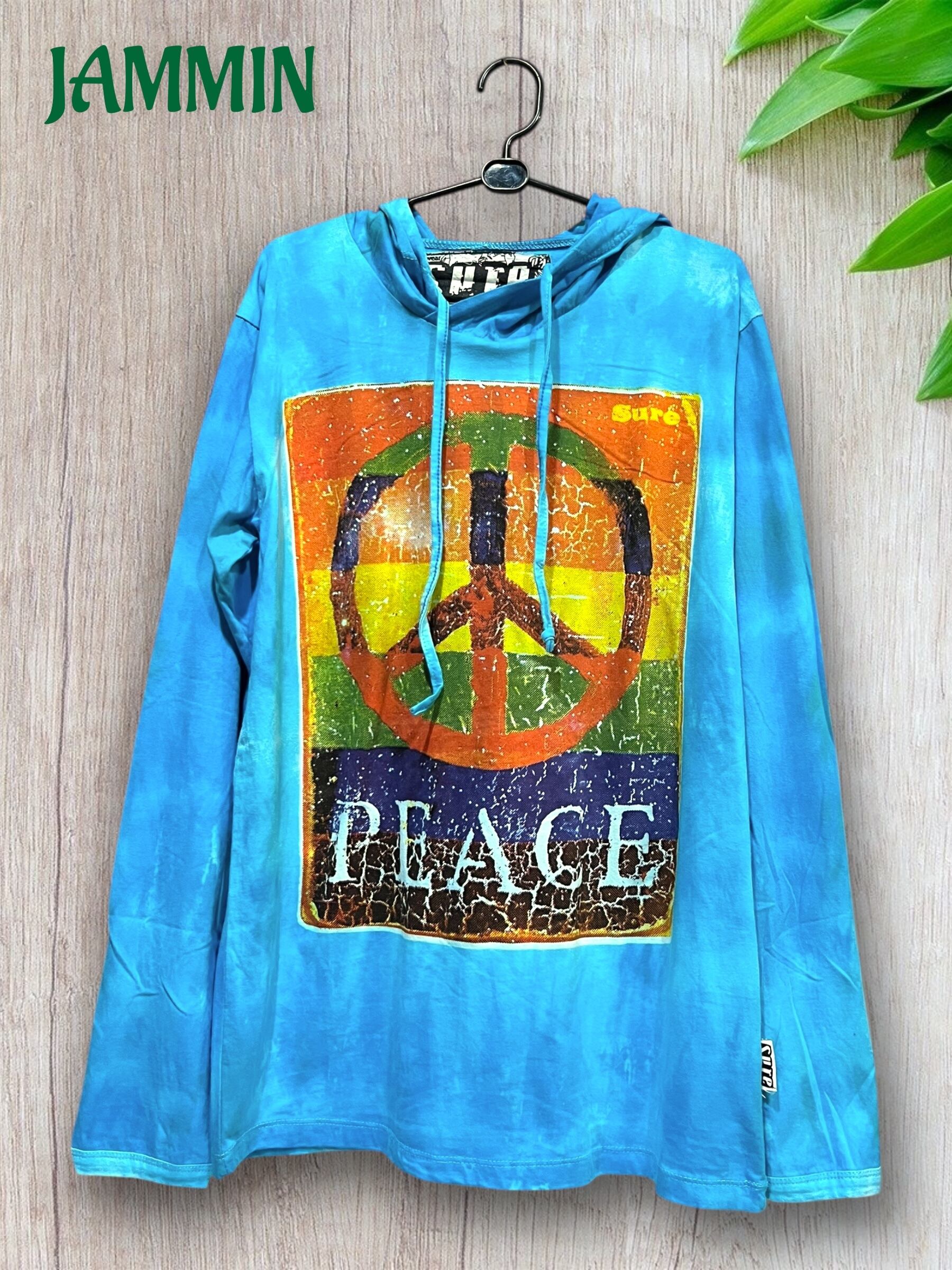 大きなピースマークプリント入りのフード付きタイダイロンTです。
