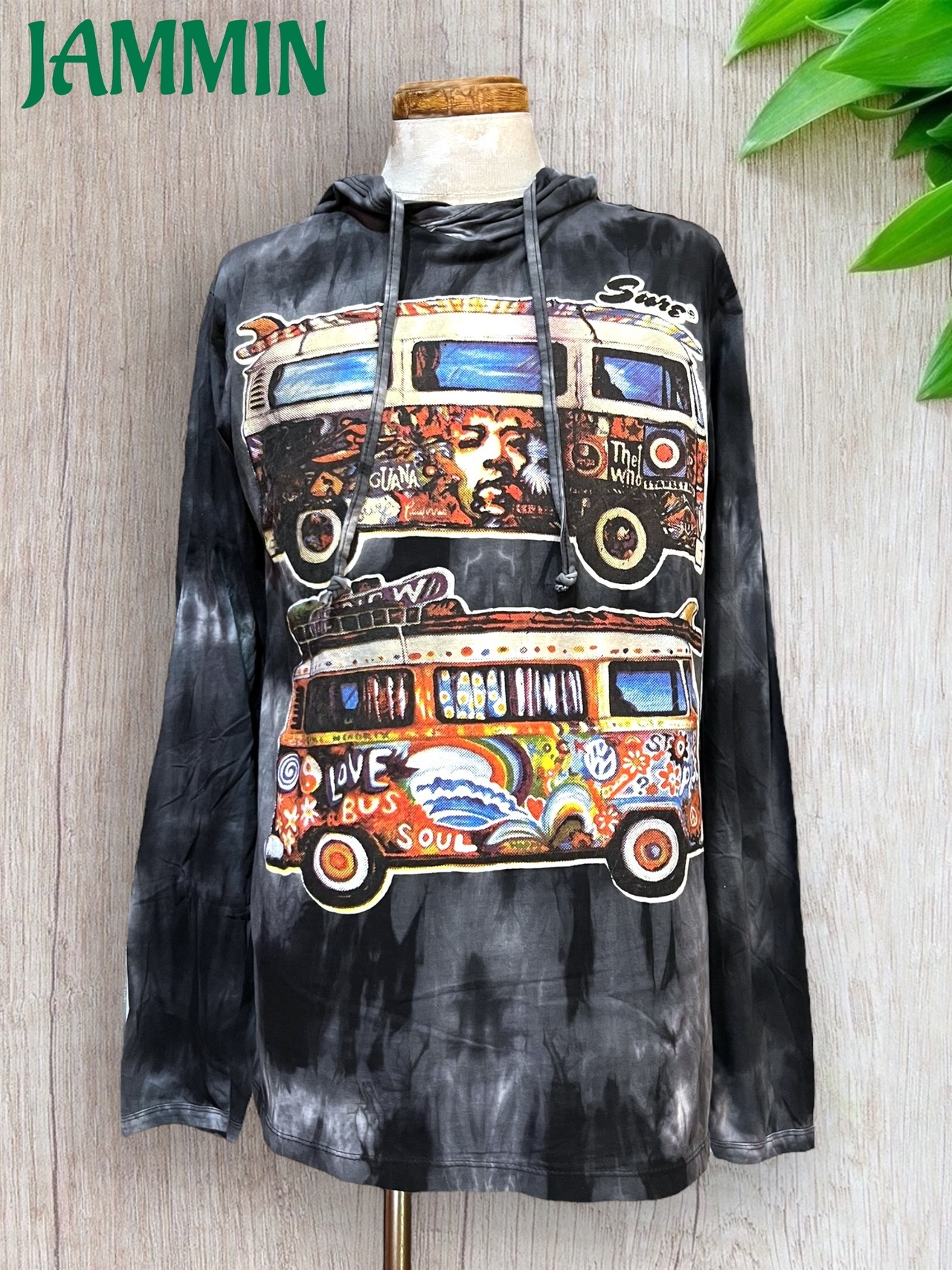 アジアン/エスニック/サイケ/ヒッピー/個性派/ロンT/長袖/Tシャツ/ロングスリーブTシャツ/フード付き/長袖/Mサイズ/ヒッピーバス/ジミヘン/