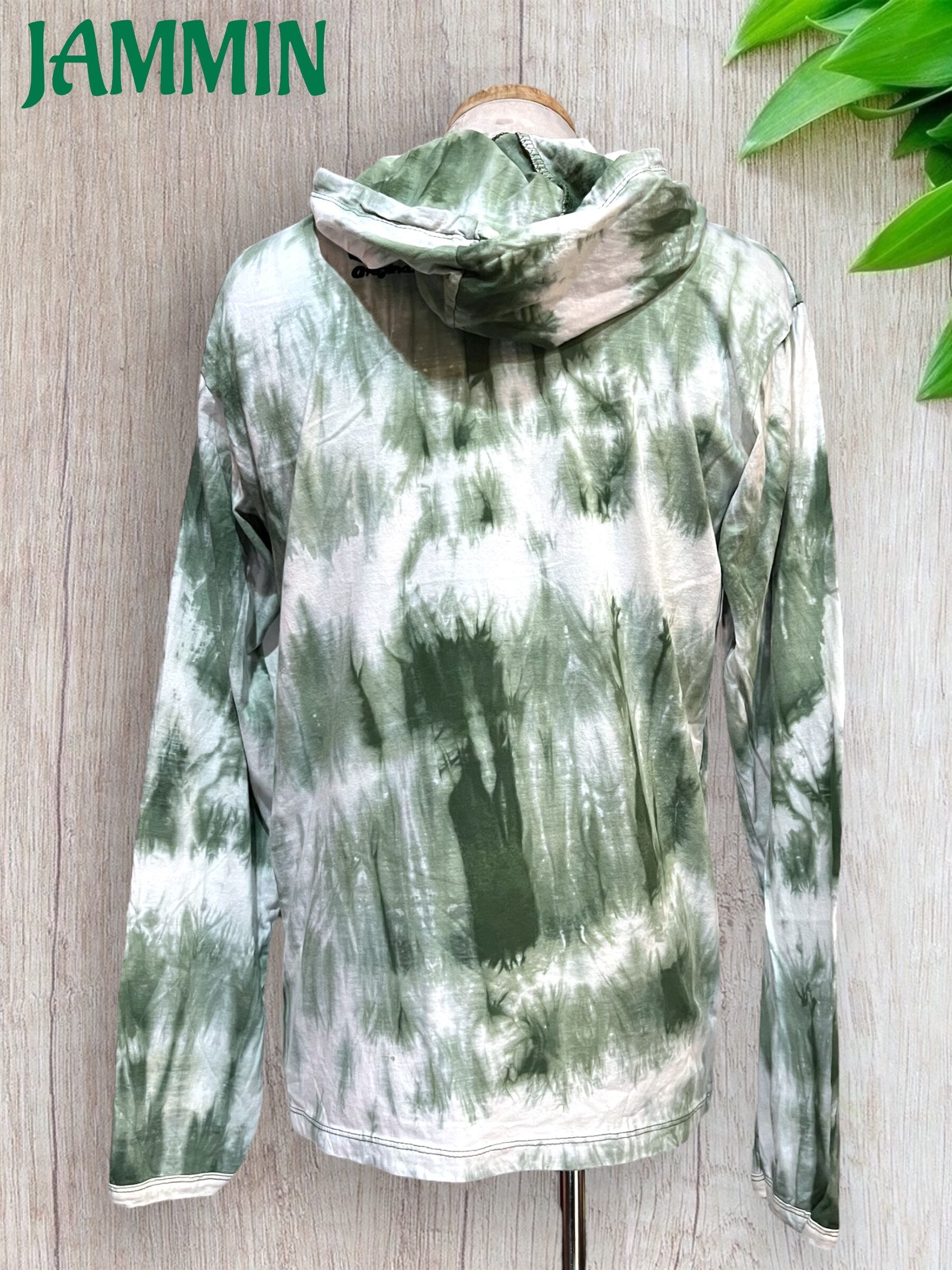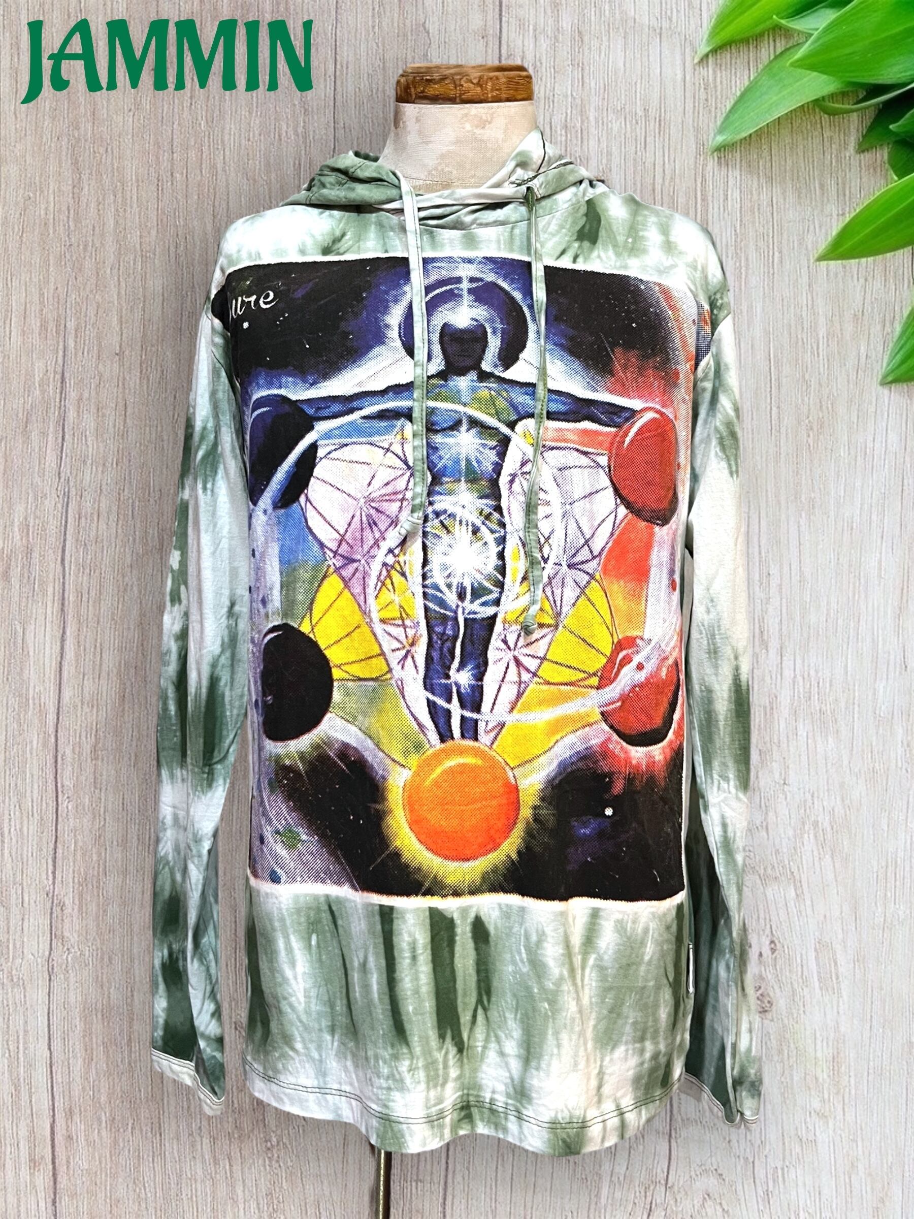 神聖幾何学プリント入りのフード付きタイダイロンTです。