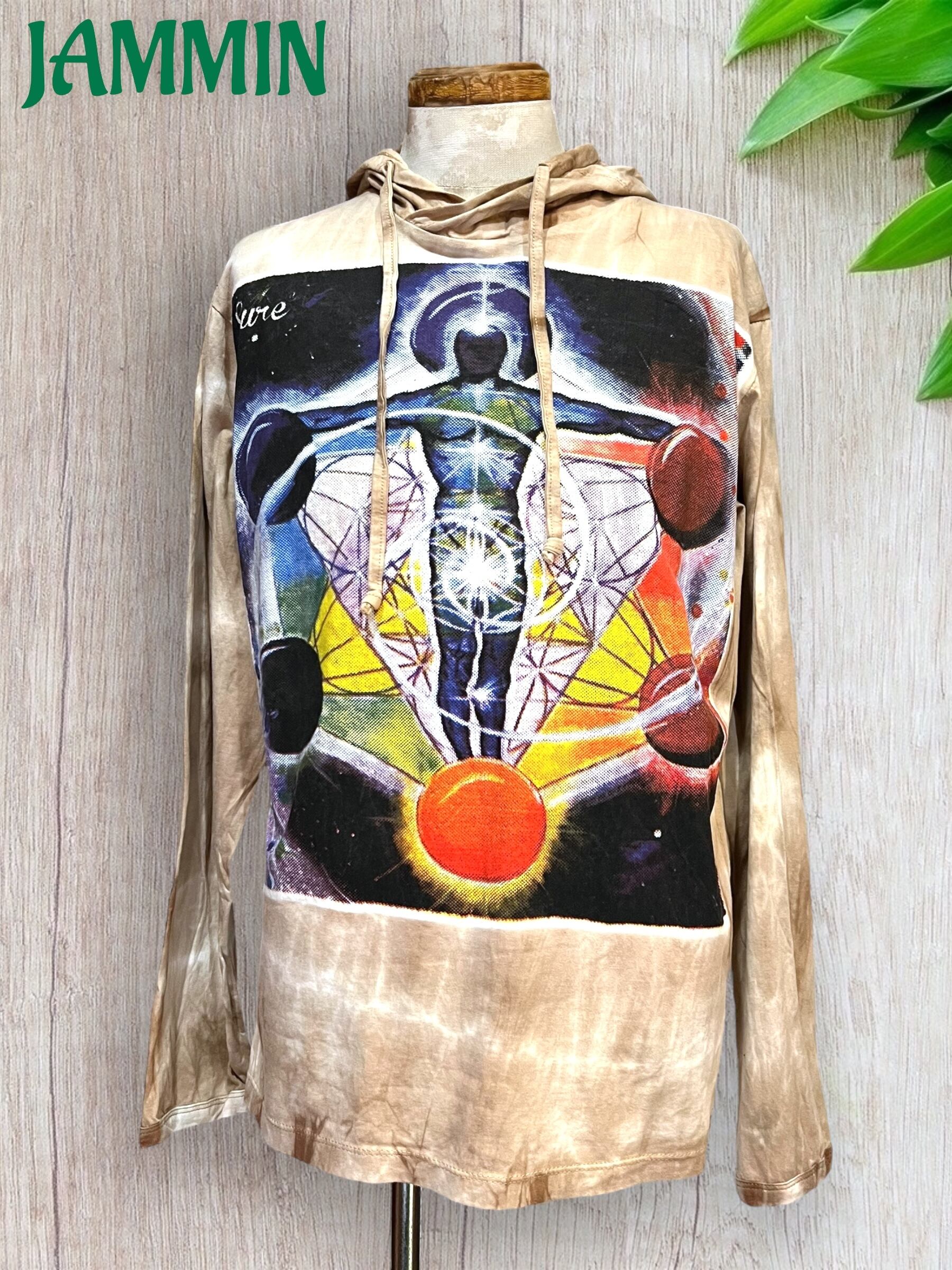 神聖幾何学プリント入りのフード付きタイダイロンTです。