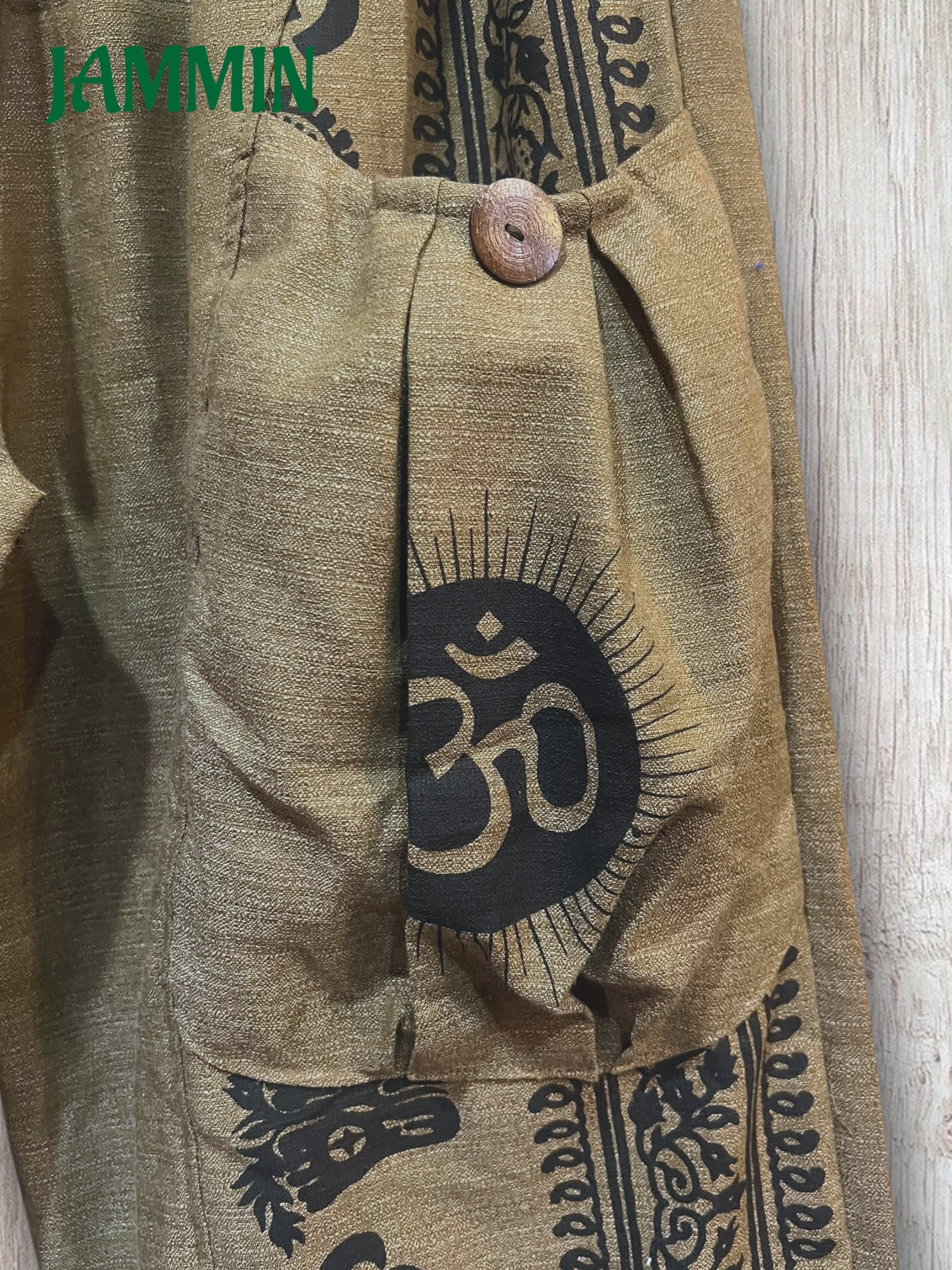 たっぷりした布使いで、裾がゴムで絞ってあるアラジンなシルエットのアジアン柄(オーム、植物柄、仏陀足跡等)入りアラジンパンツです。