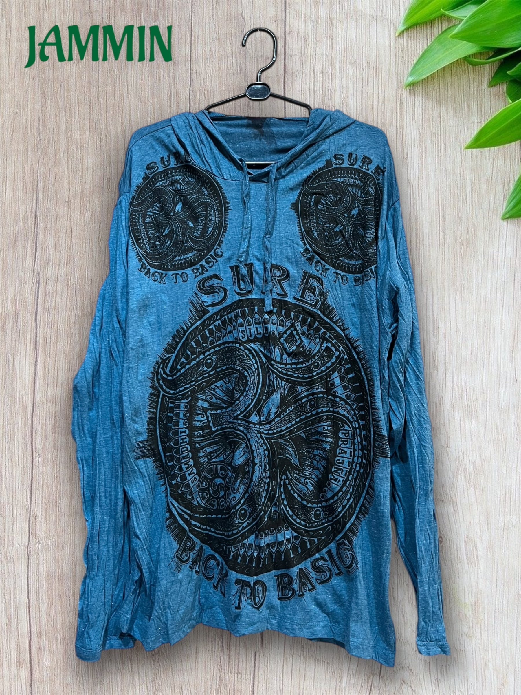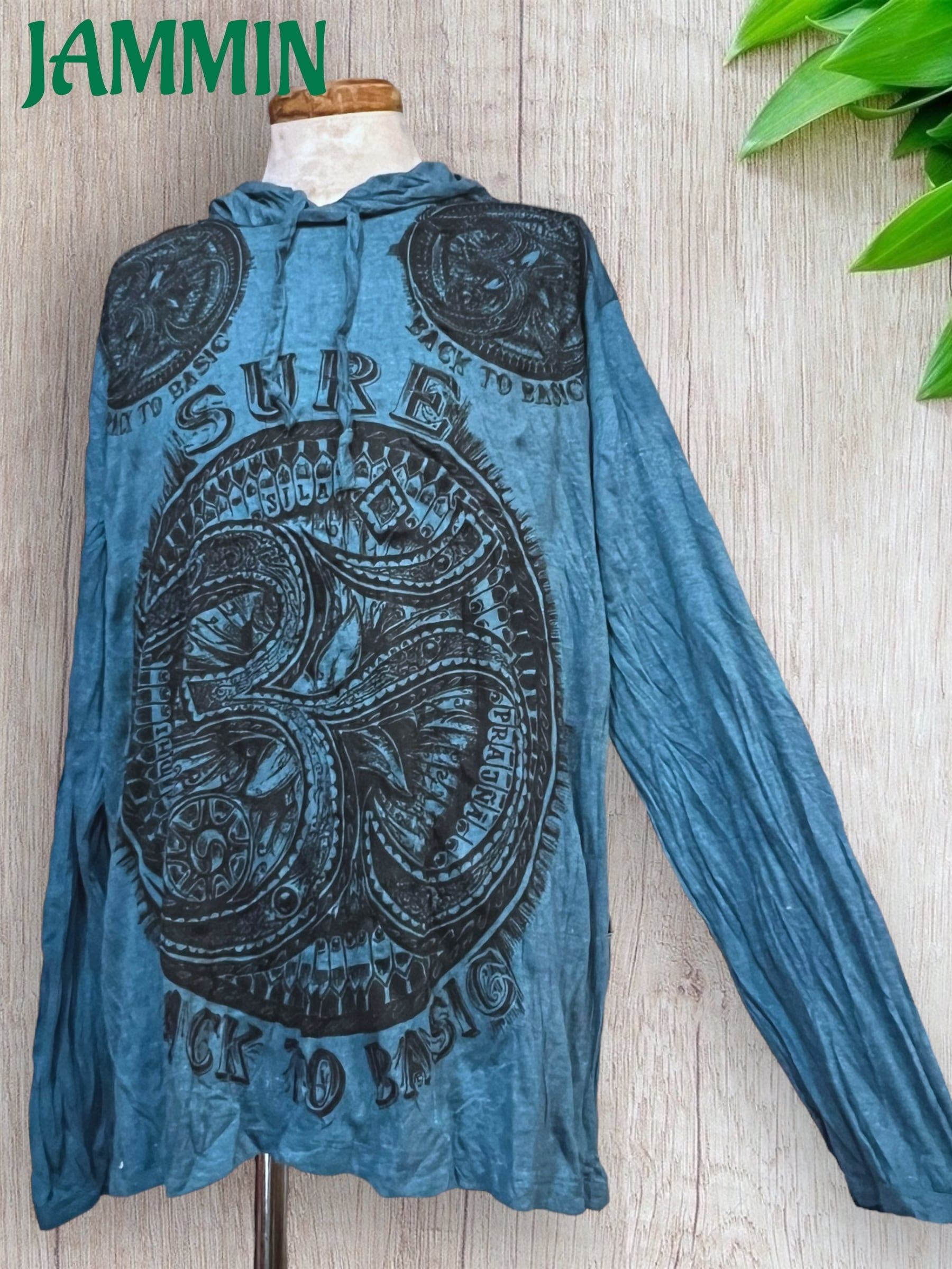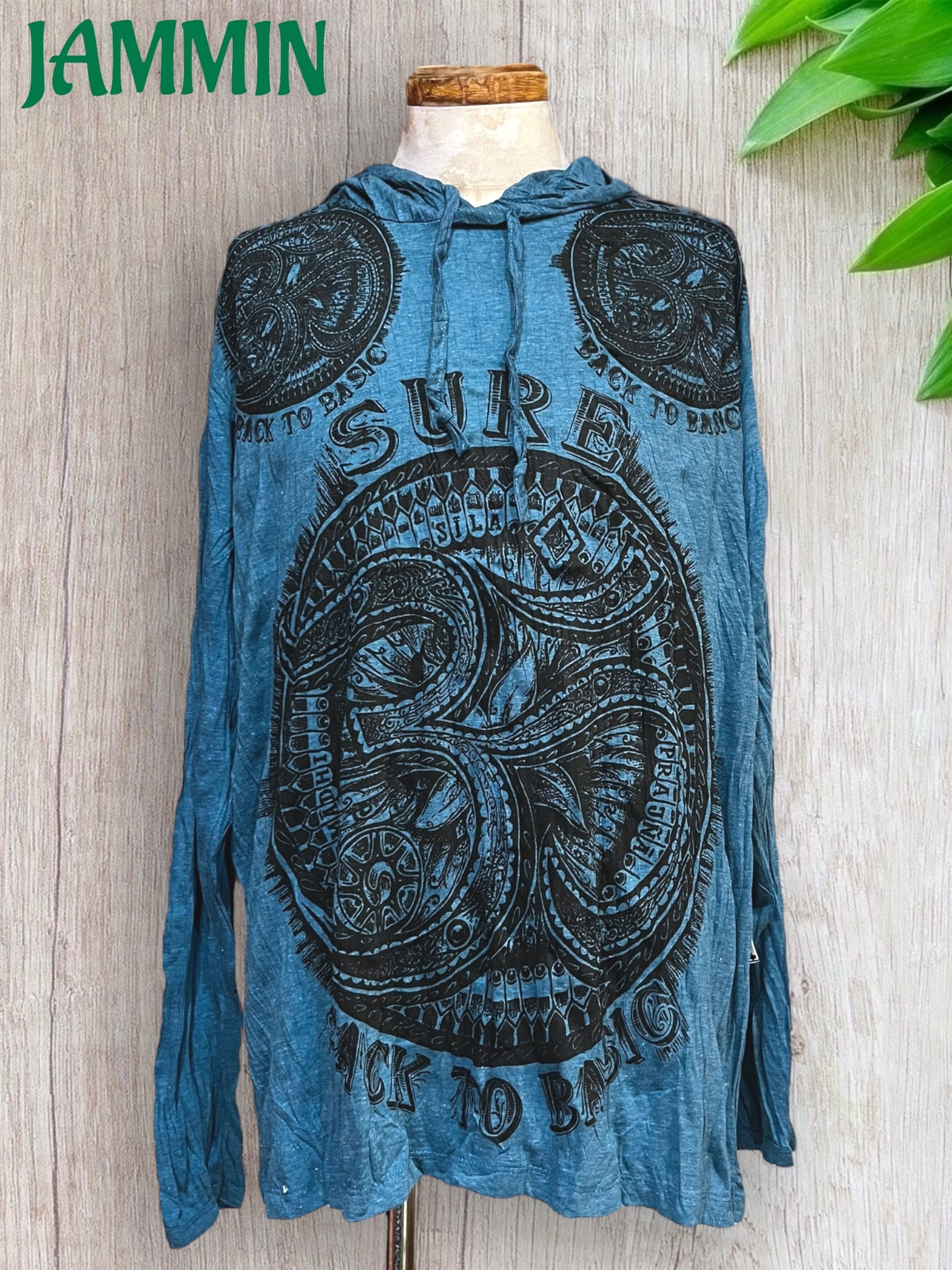 アジアン/エスニック/サイケ/ヒッピー/個性派/ロンT/長袖/Tシャツ/ロングスリーブTシャツ/フード付き/長袖/Lサイズ/オーム/オム/OM/魔除け/お守り/宇宙/ヨガ/