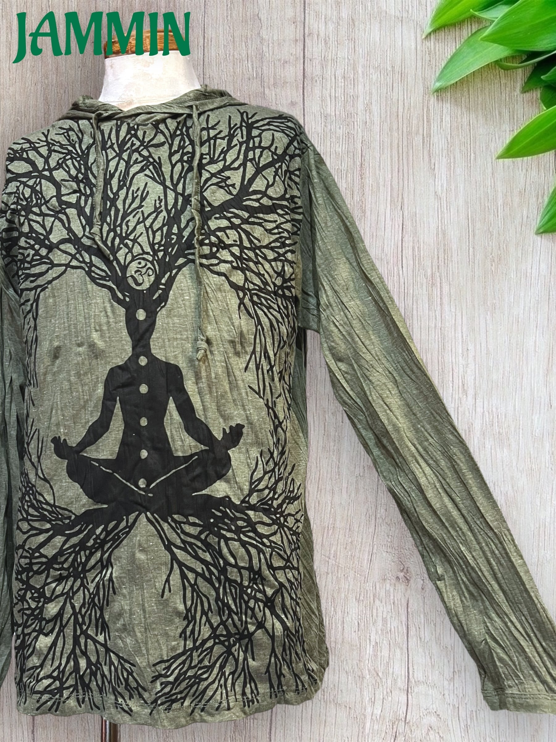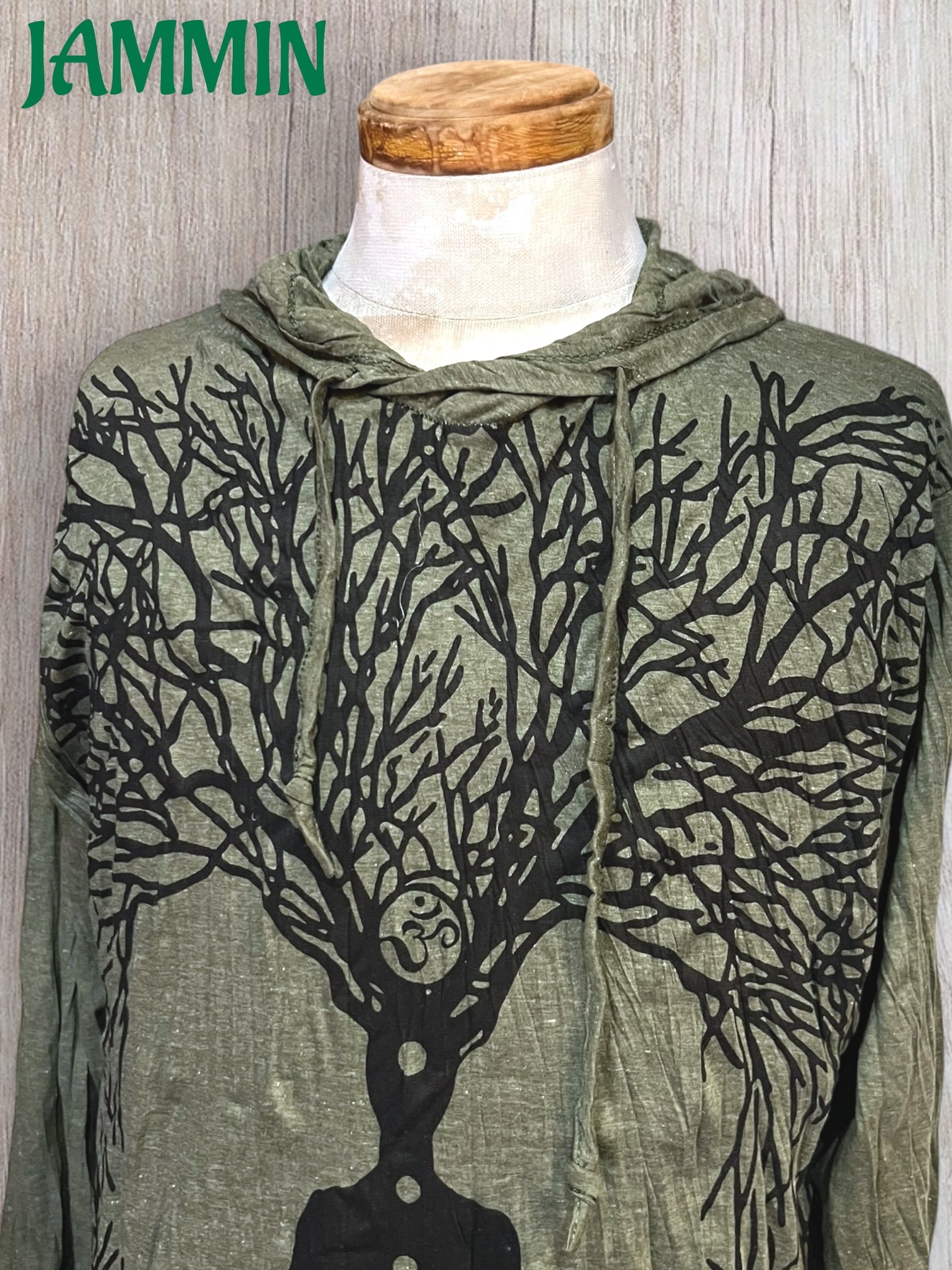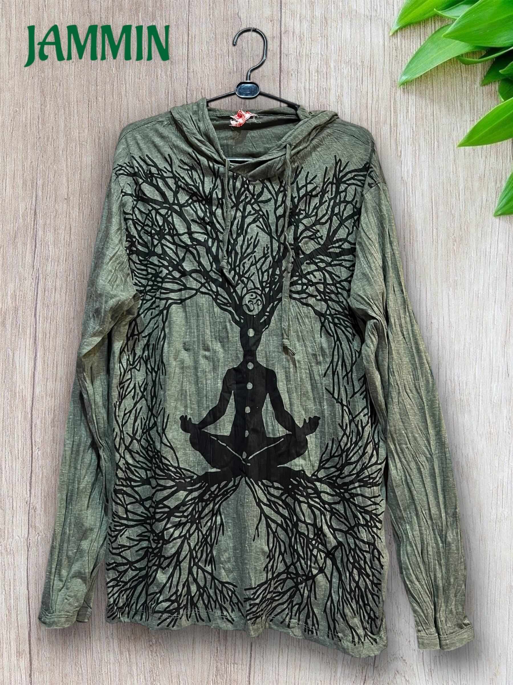 アジアン/エスニック/サイケ/ヒッピー/個性派/ロンT/長袖/Tシャツ/ロングスリーブTシャツ/フード付き/長袖/Lサイズ/オーム/オム/OM/魔除け/お守り/宇宙/ヨガ/瞑想/チャクラ/ツリーオブライフ