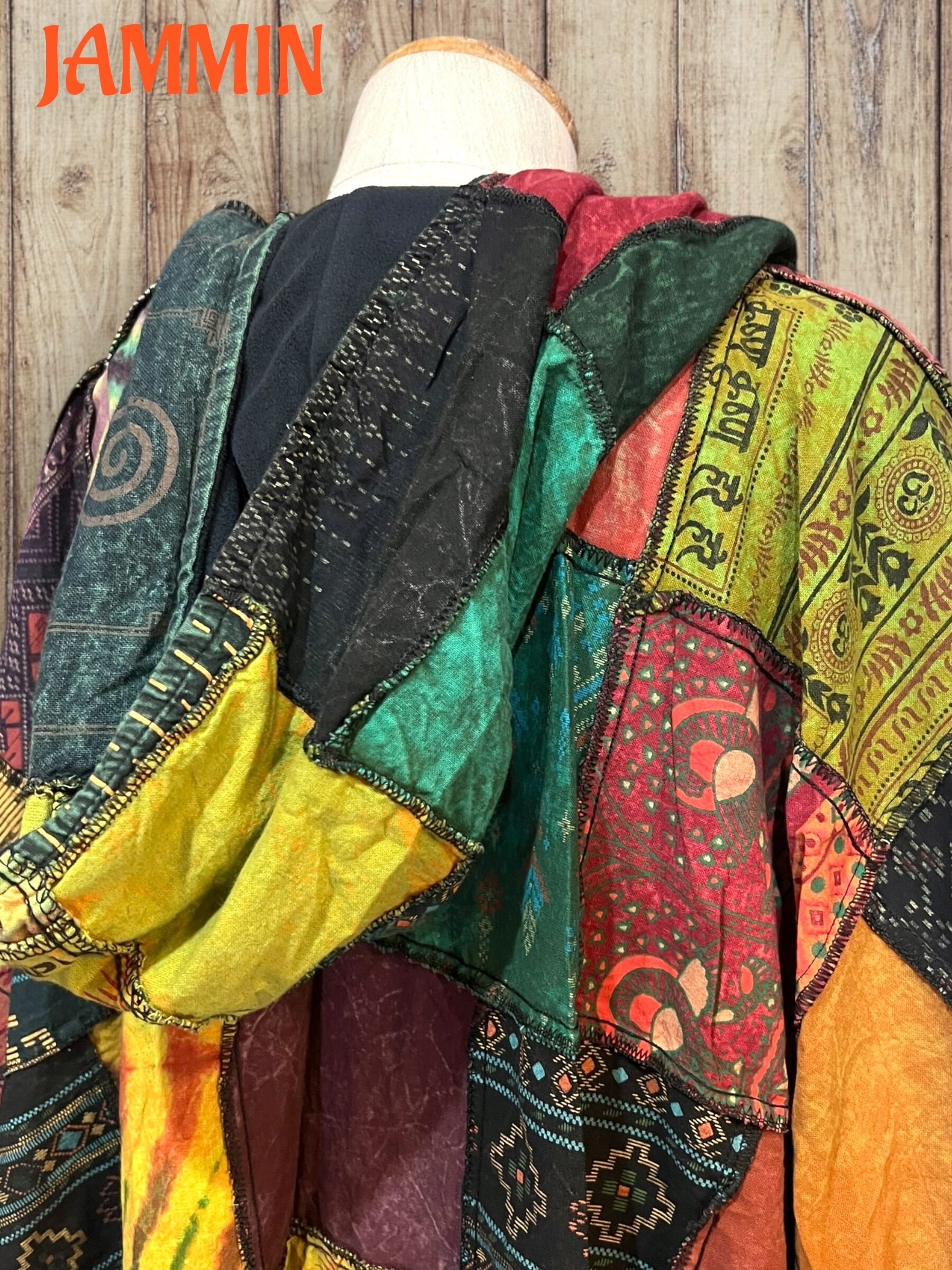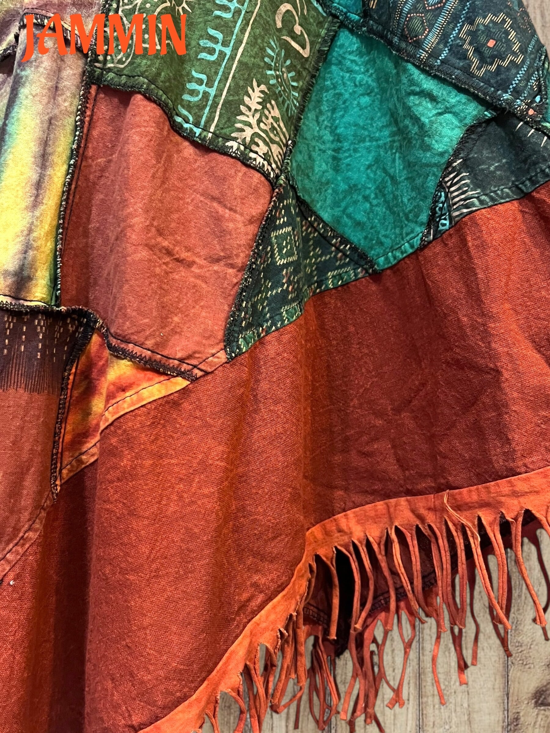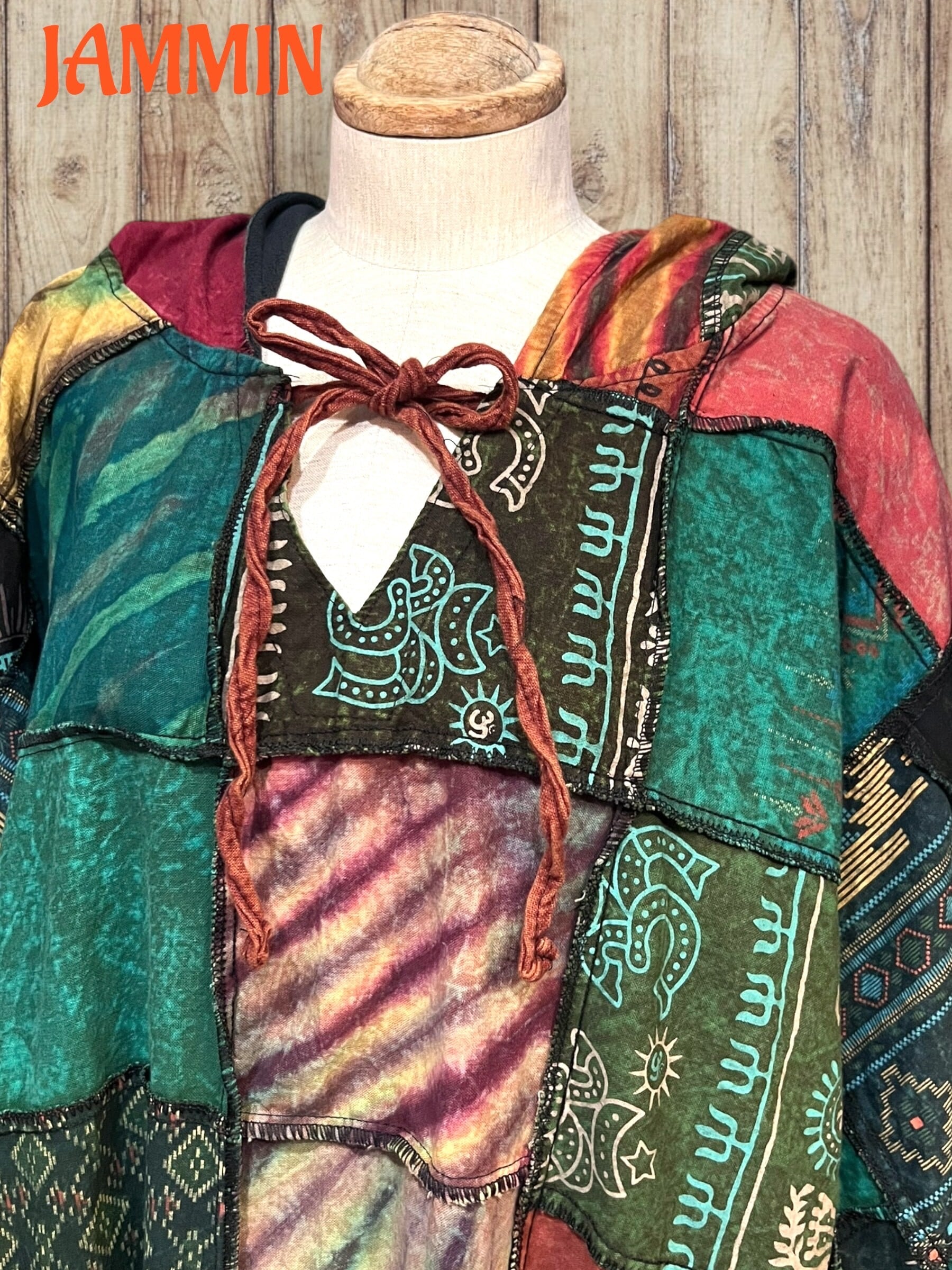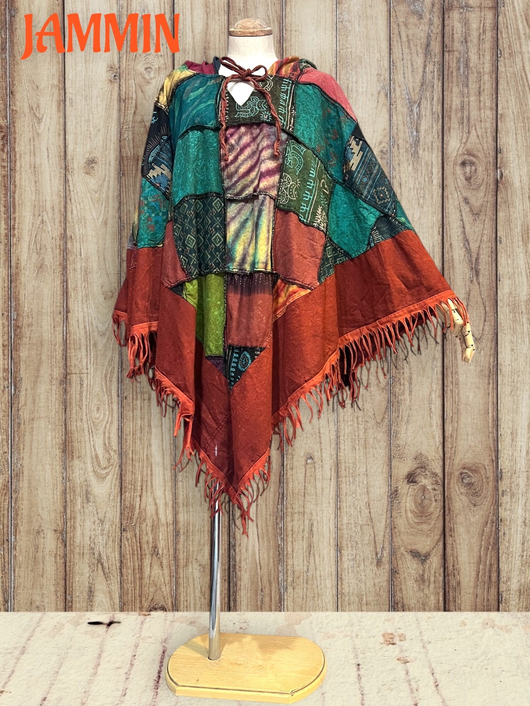 色々な柄生地(オーム、ヒンディ語、植物、タイダイ、モン族刺繍柄など)を使ったパッチワークフリンジポンチョです。
