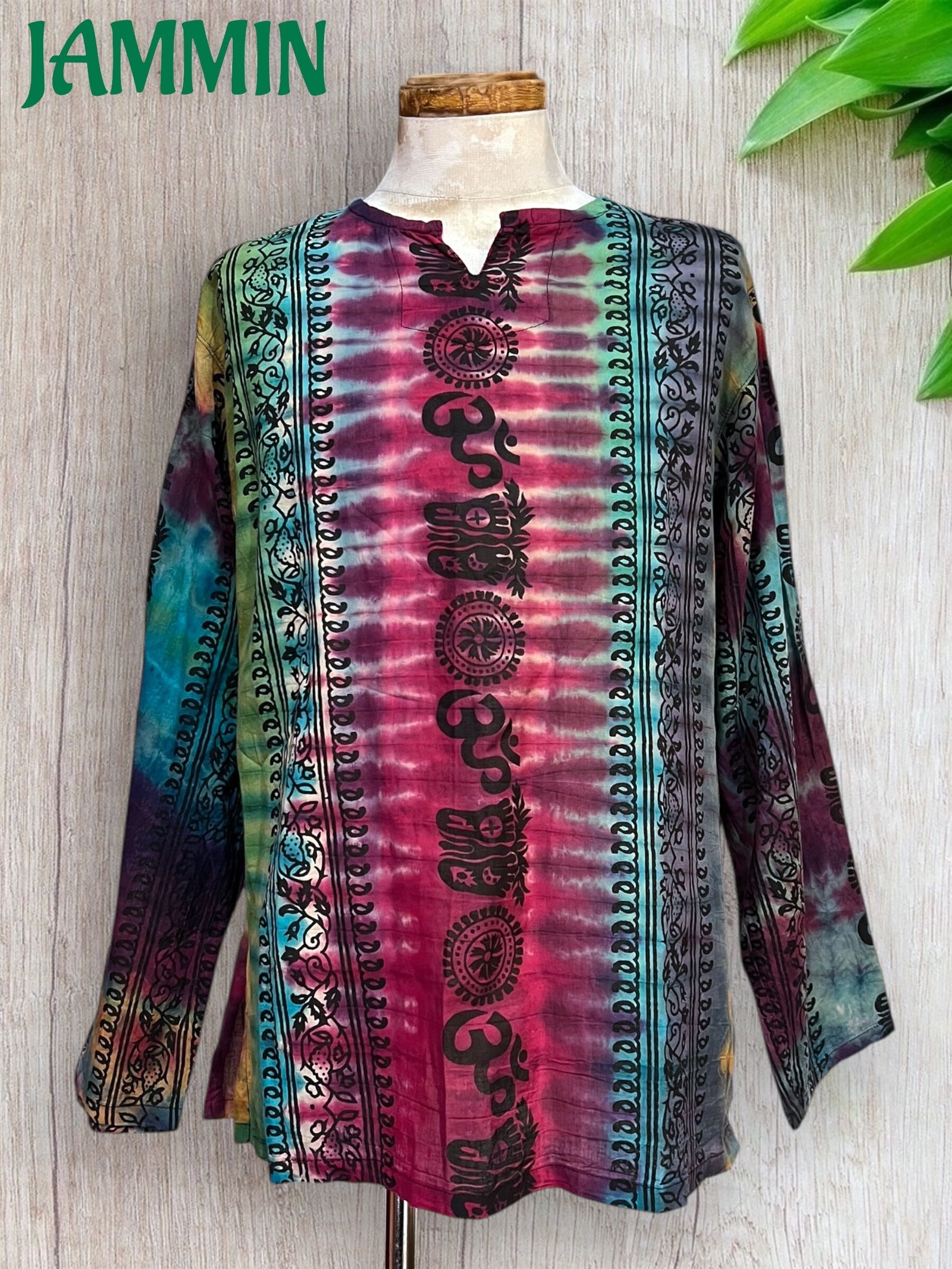 アジアン柄(オーム、仏陀足跡、紋様など)入りのタイダイ長袖クルタです。