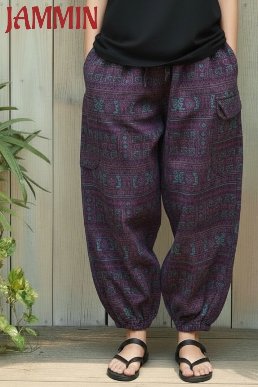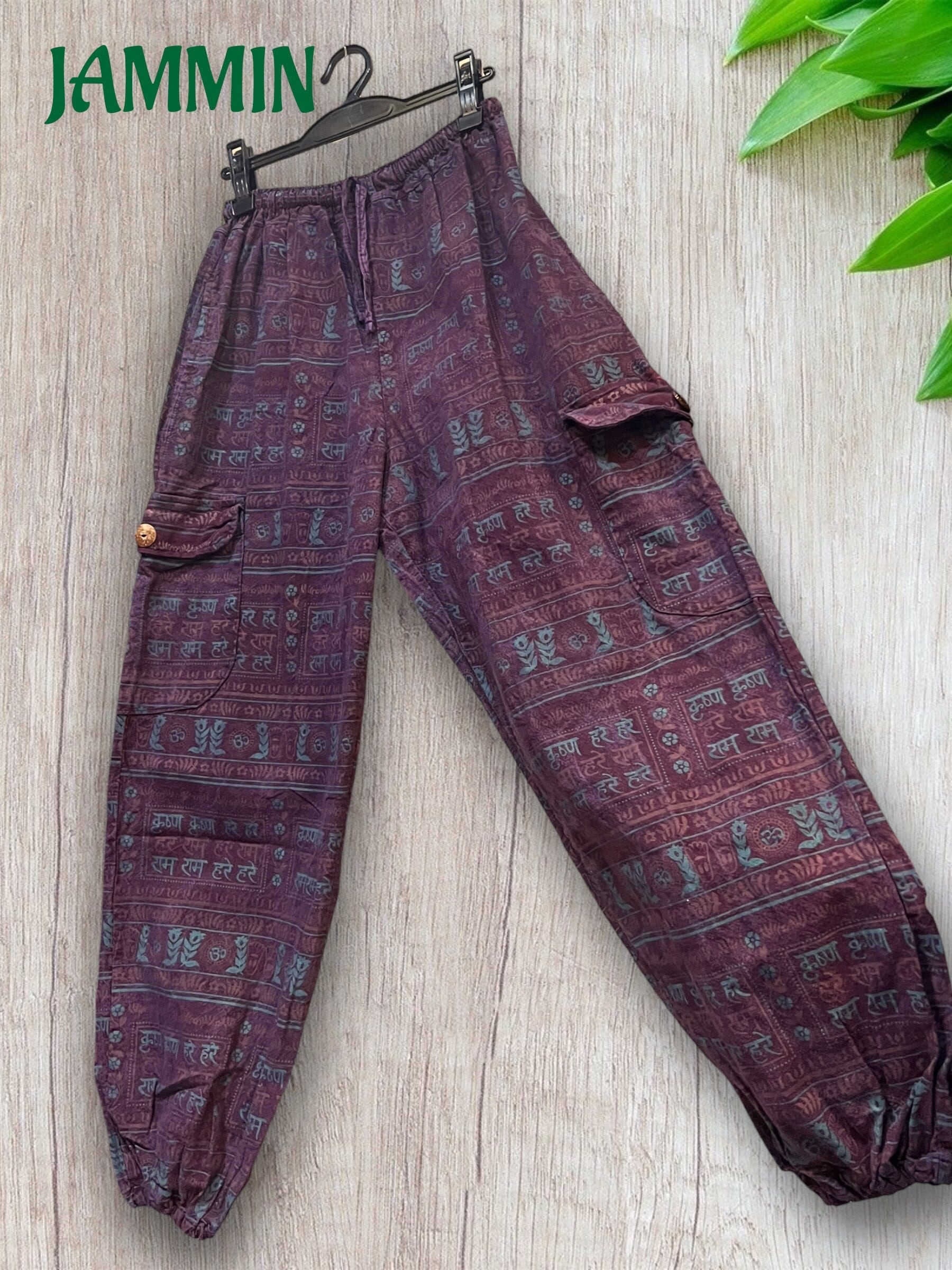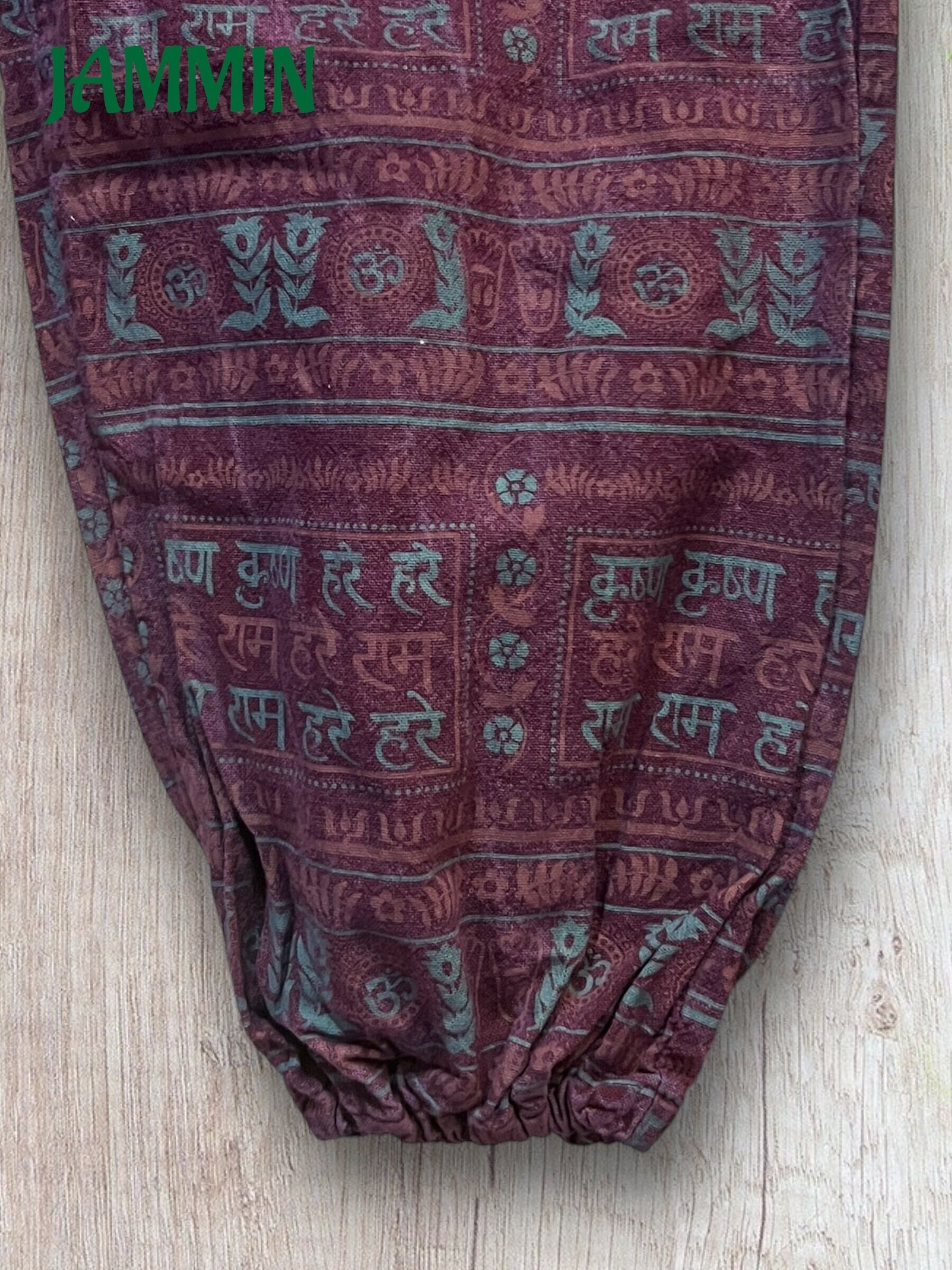 アジアンな柄(オーム、ヒンディ語、仏陀足跡、植物など)のゆるめパンツです。