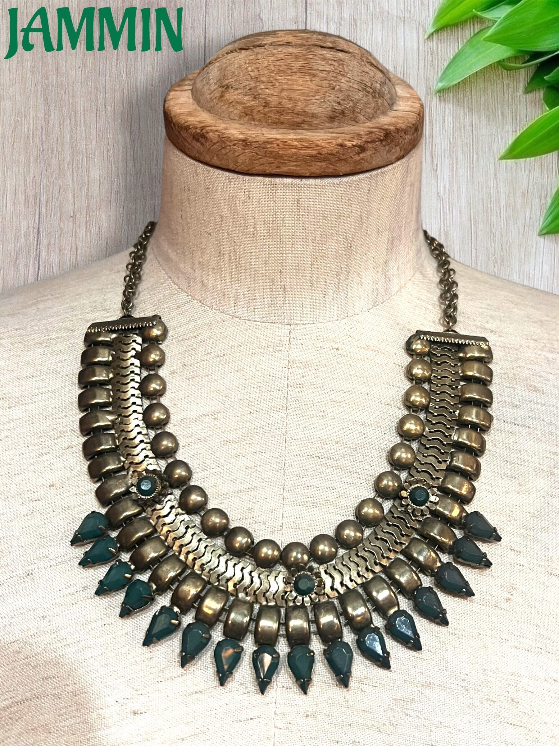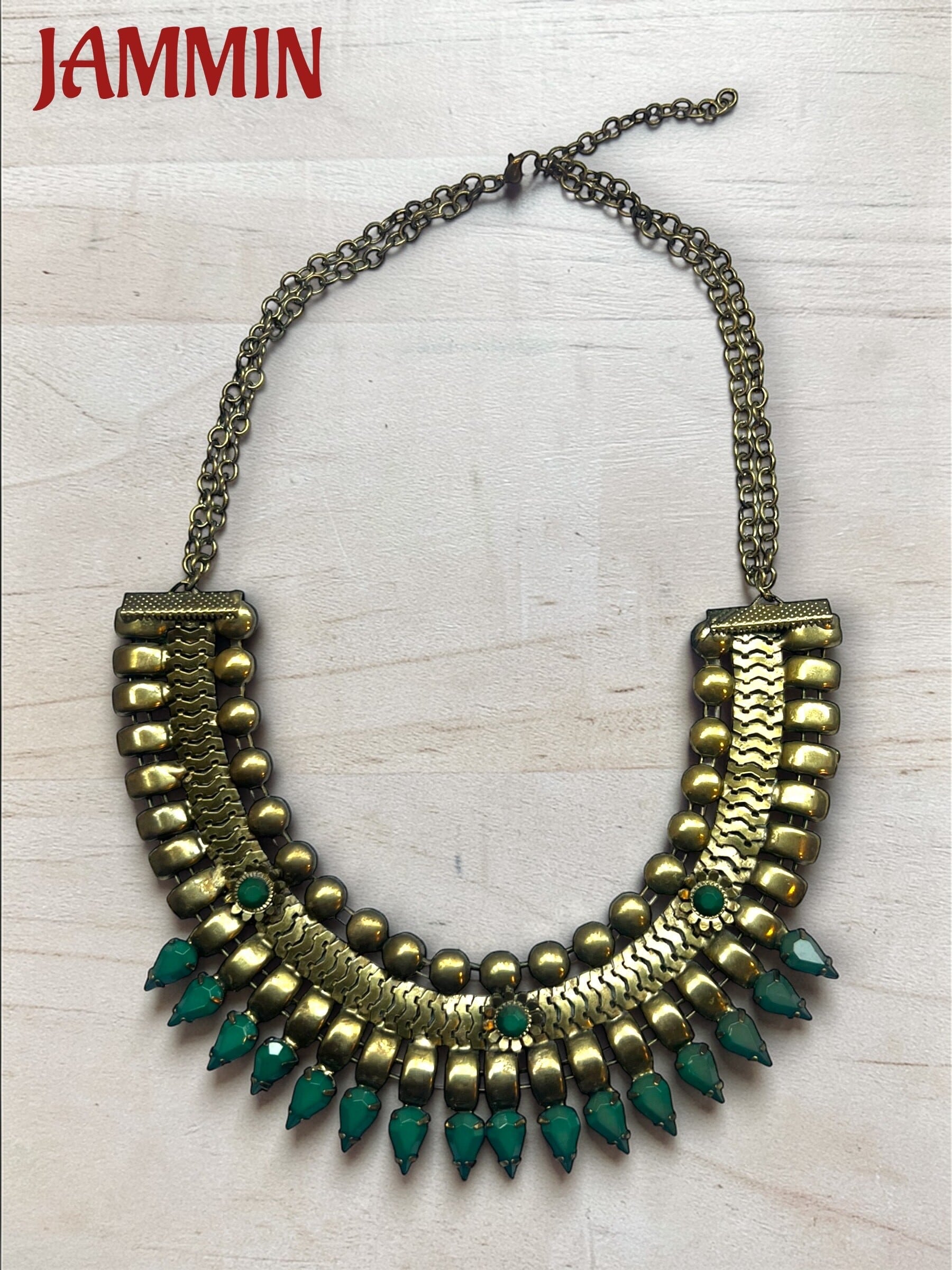 ラインストーンやブラスパーツ、金属パーツなどを使った個性的なビンテージネックレスです。