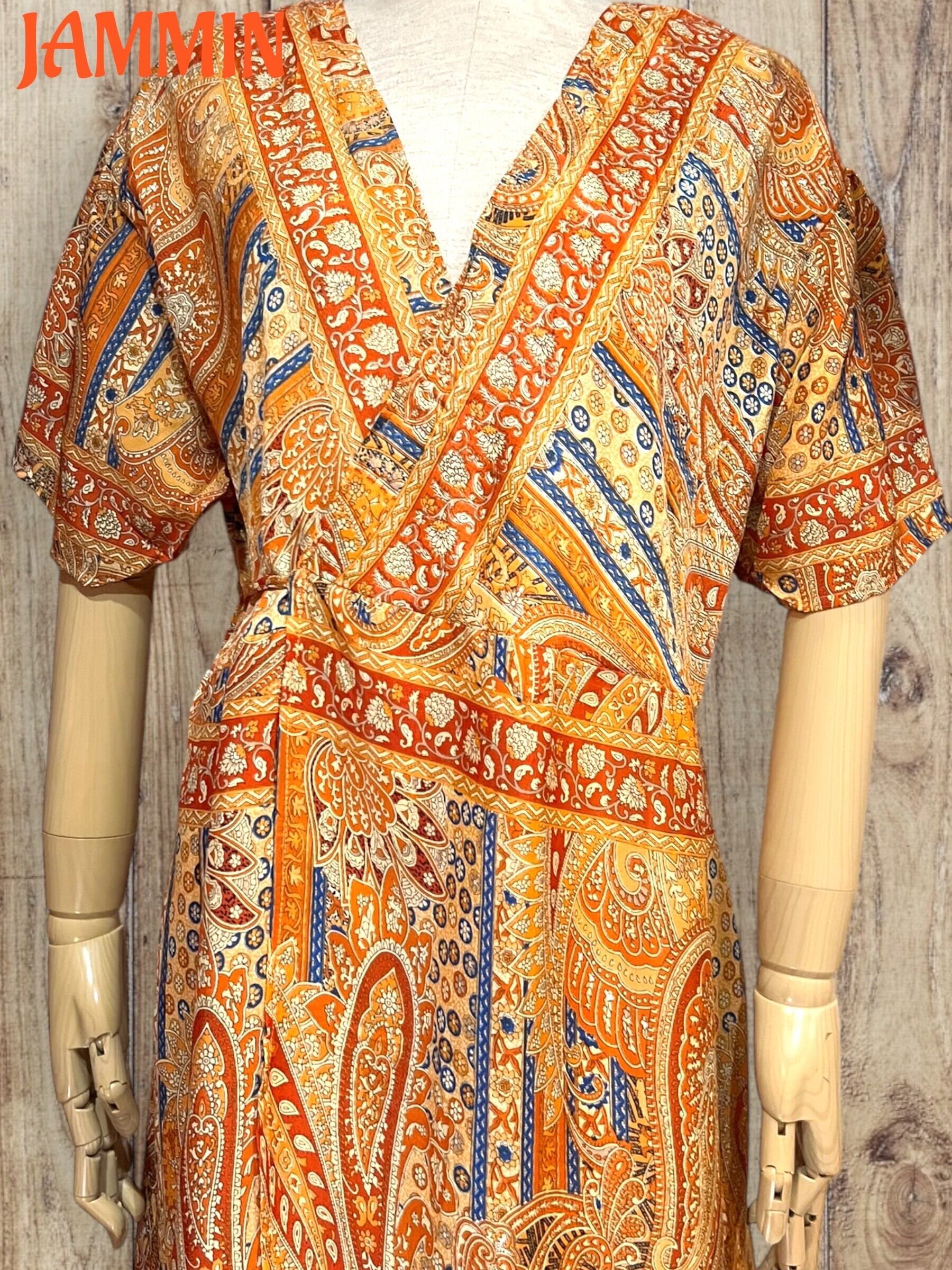 アジアンなペーズリー柄のカシュクールロングワンピです。