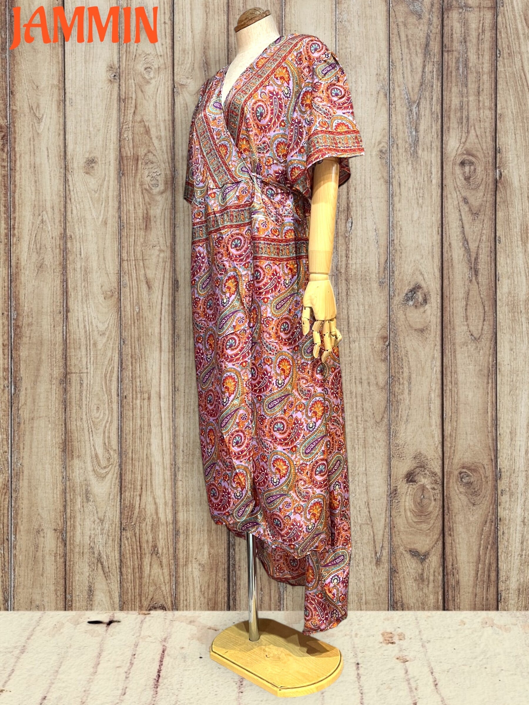 アジアンなペーズリー柄のカシュクールロングワンピです。