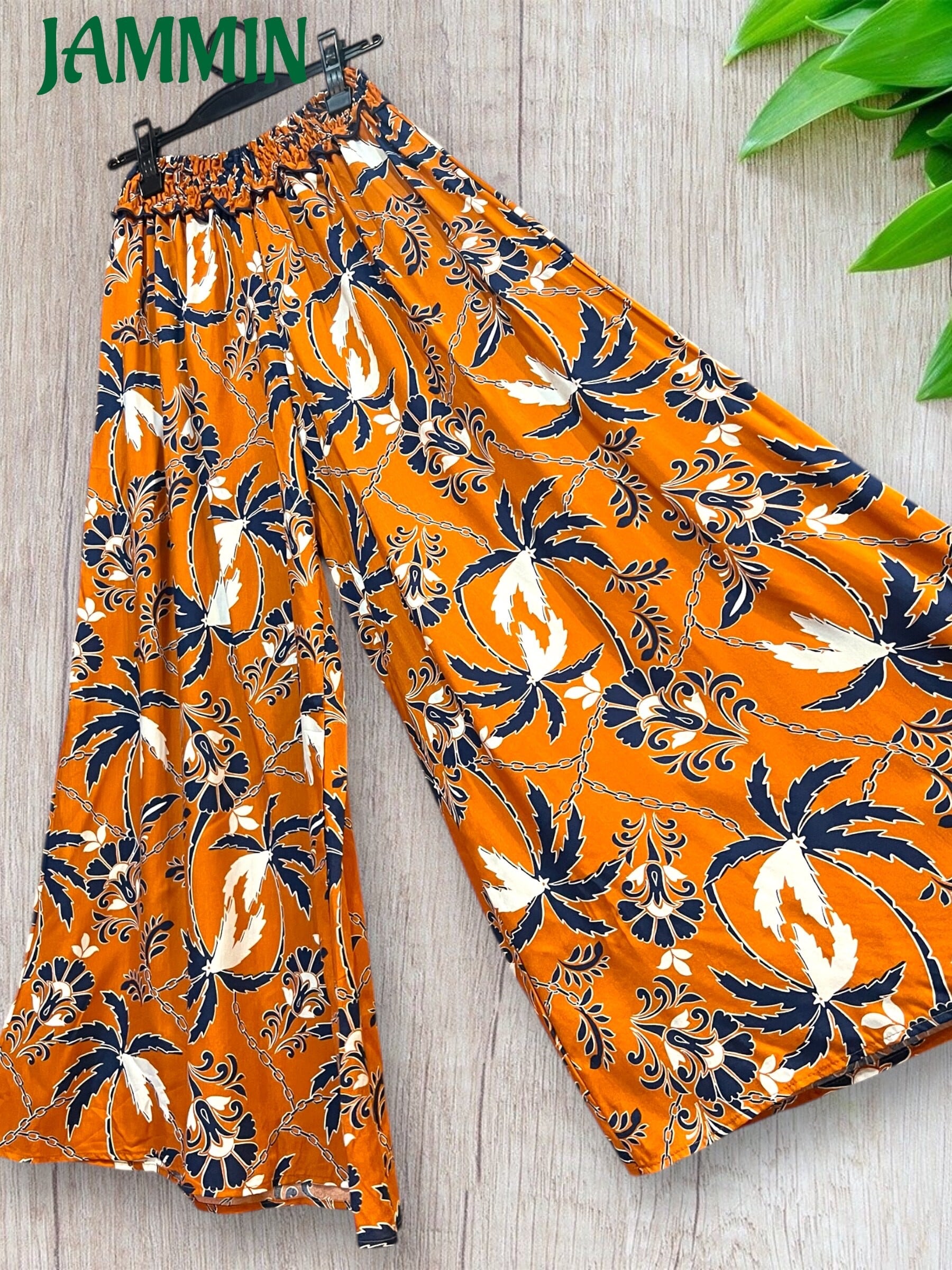 アジアンなヤシの木植物柄の超ワイドパンツです。