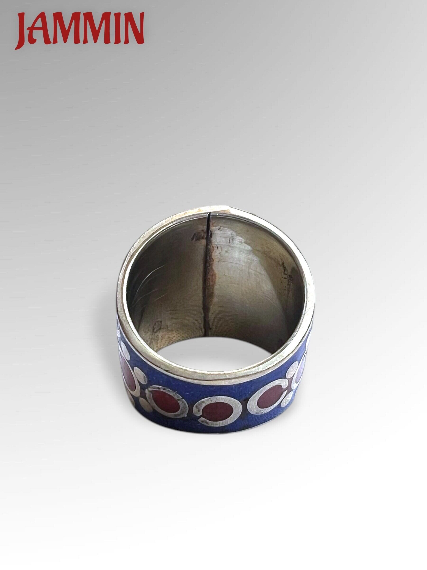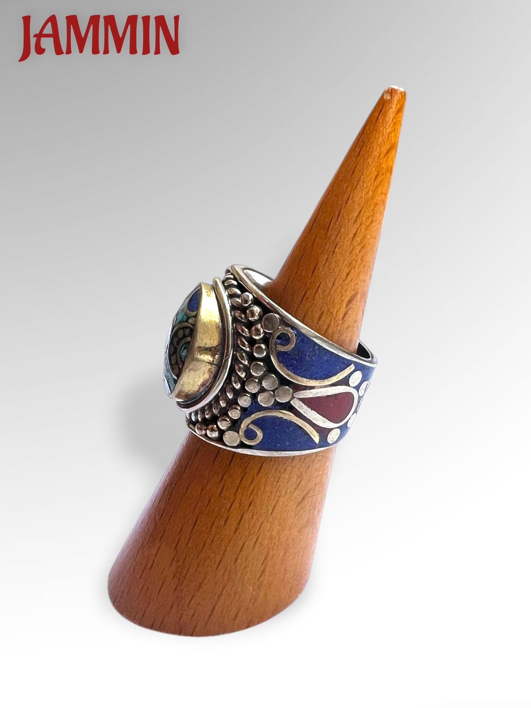 ターコイズ、ラピスラズリ、コーラルを使ったアジアンな指輪です。