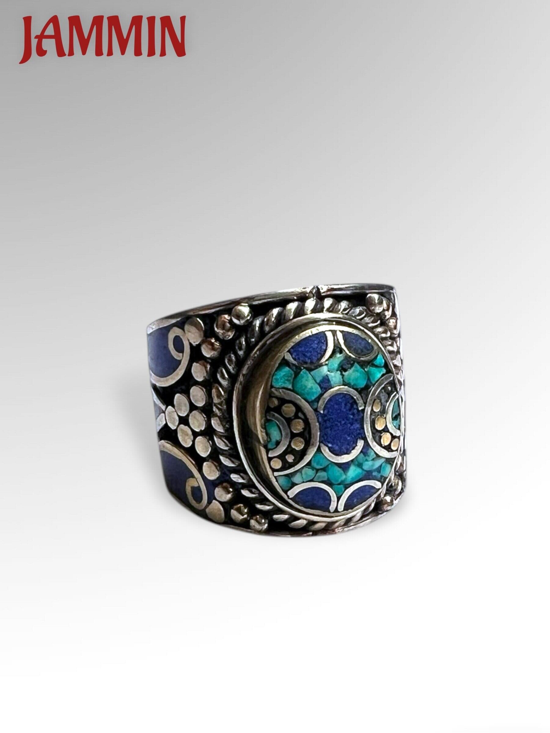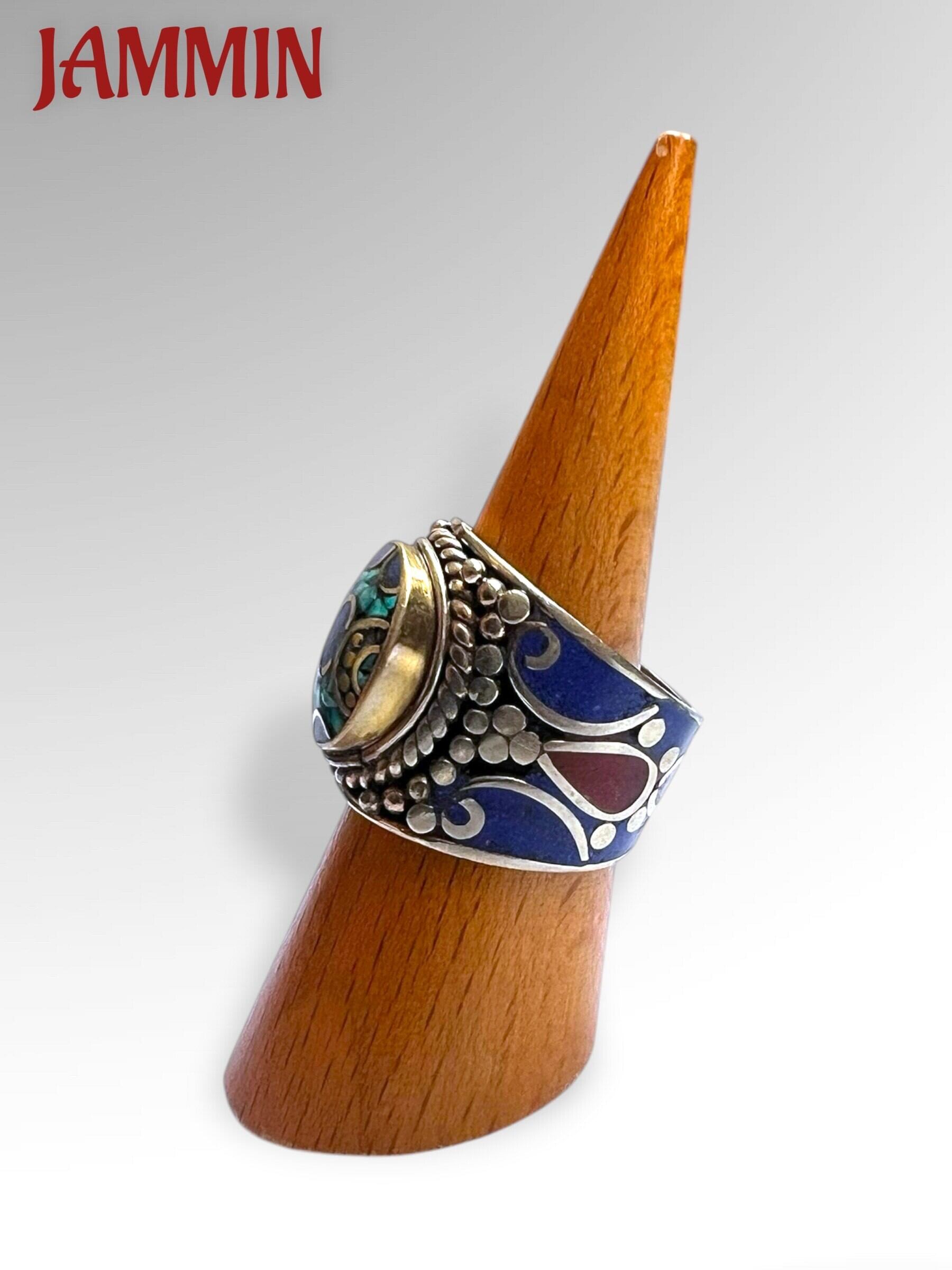 ターコイズ、ラピスラズリ、コーラルを使ったアジアンな指輪です。