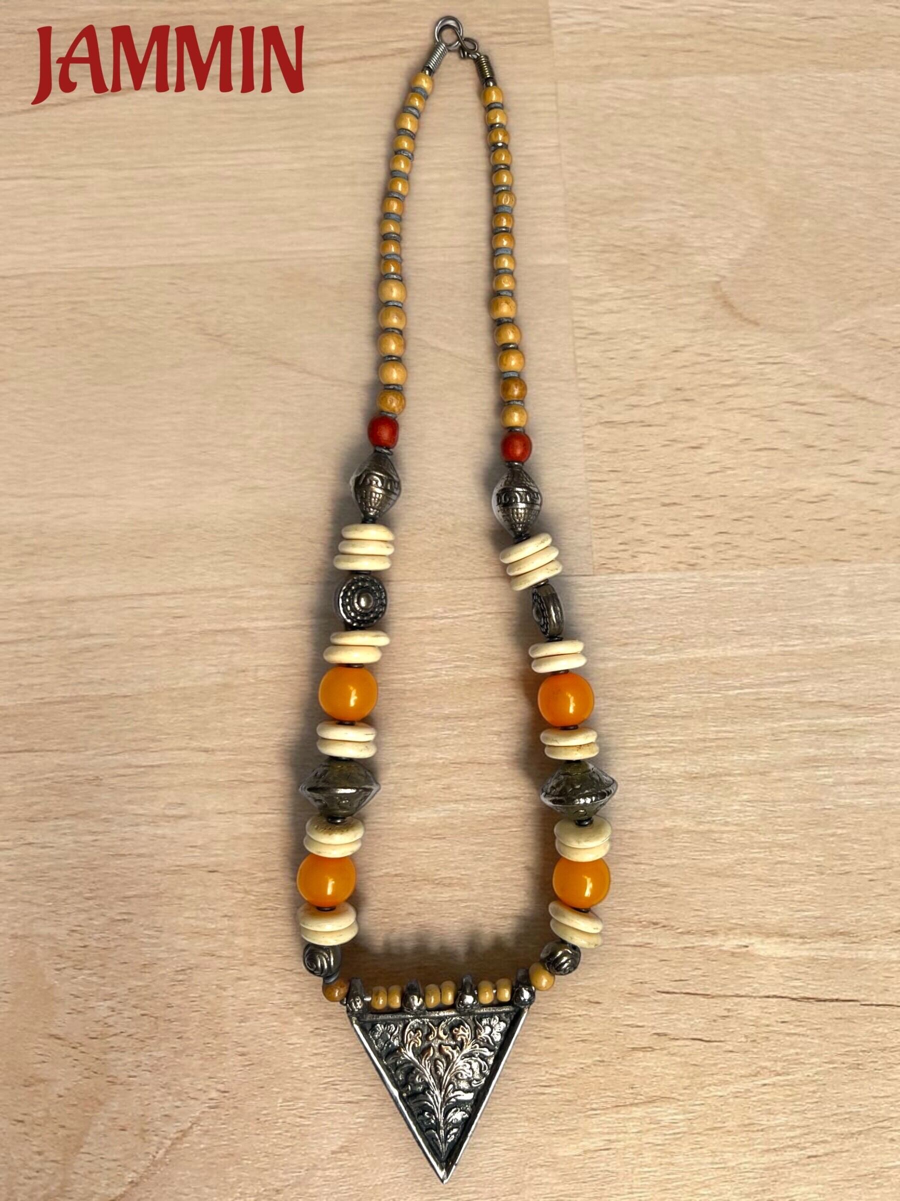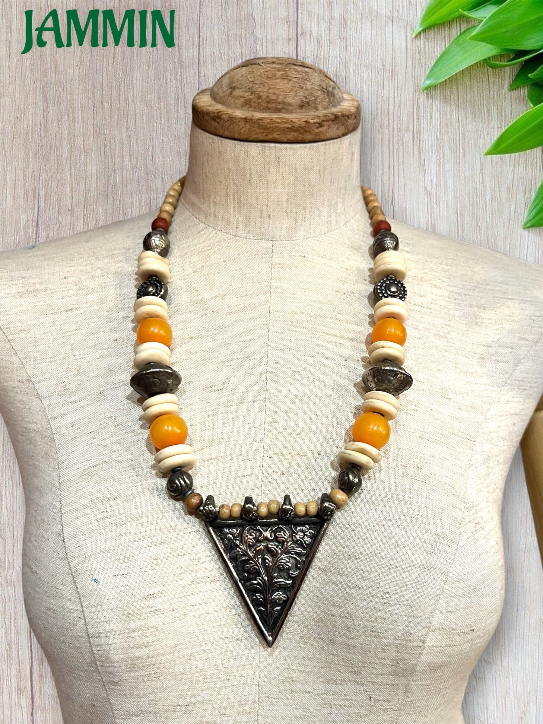 逆三角形のブラスプレートとボーンビーズ、樹脂ビーズなどを使った個性的なネックレスです。