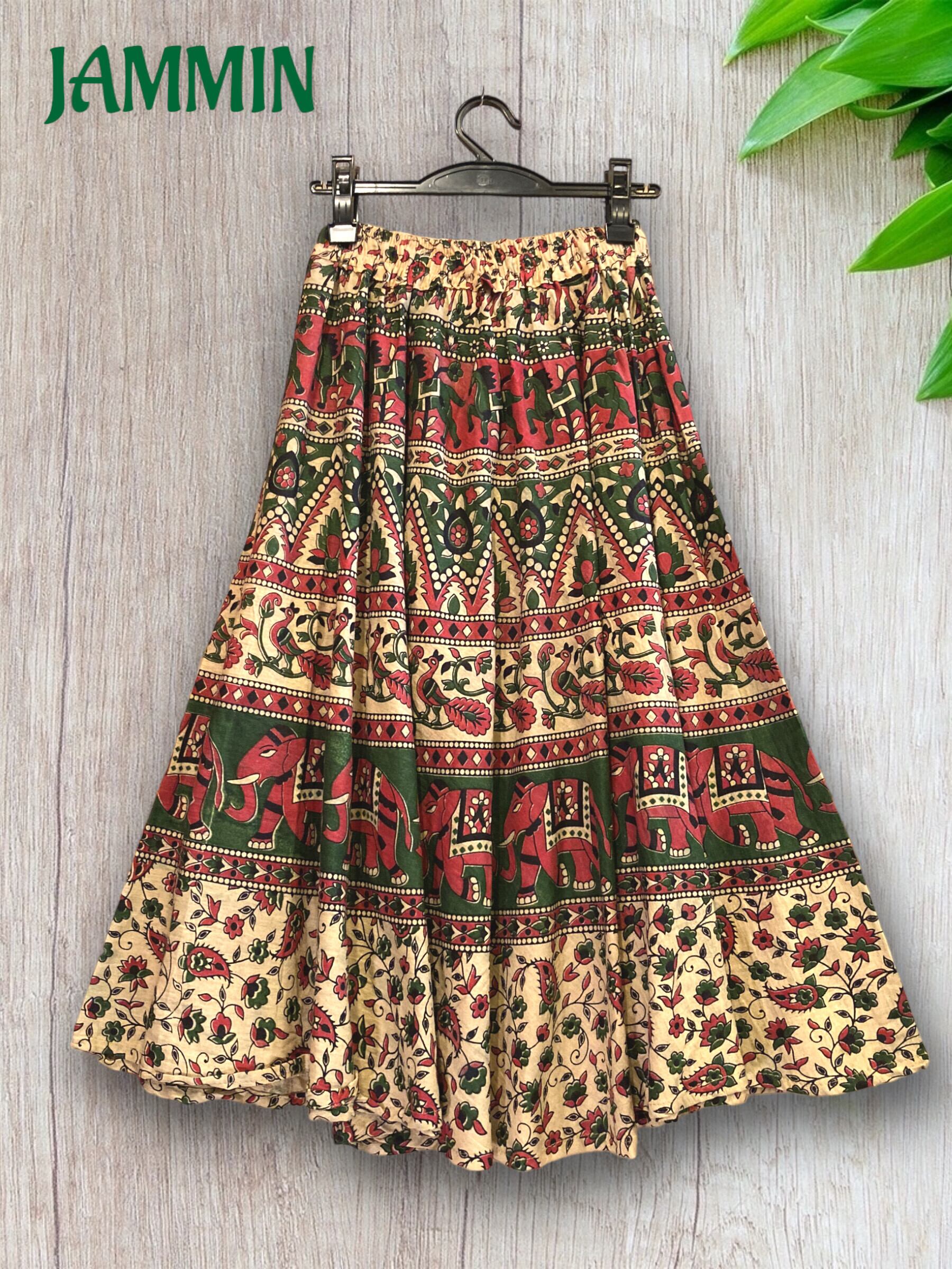アジアンなアニマル(象、馬、孔雀)ペーズリー植物柄のフレアスカートです。