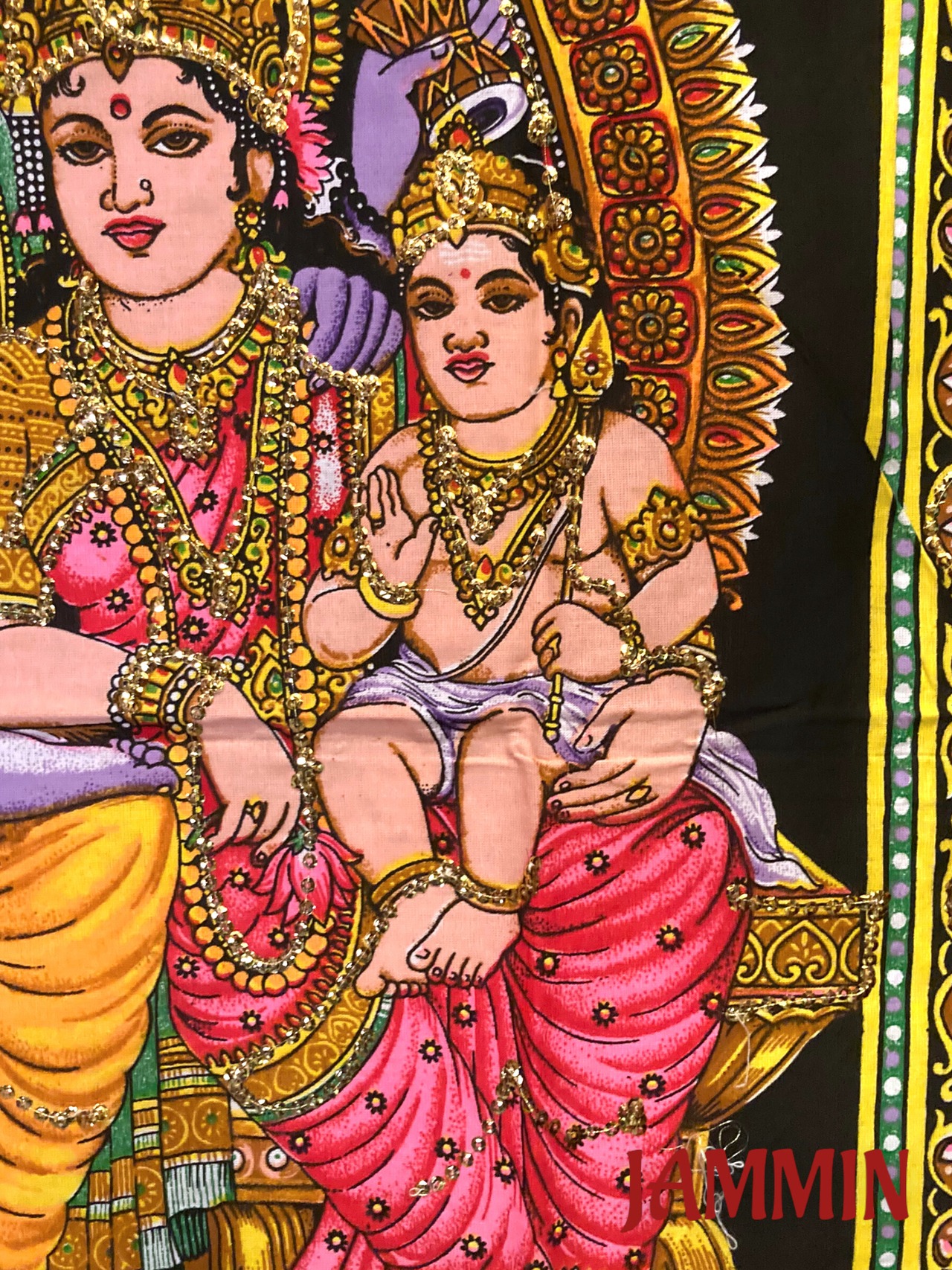 シヴァ神一家(シヴァ、パールヴァティ、ガネーシャ)のカラフルなタペストリーです。