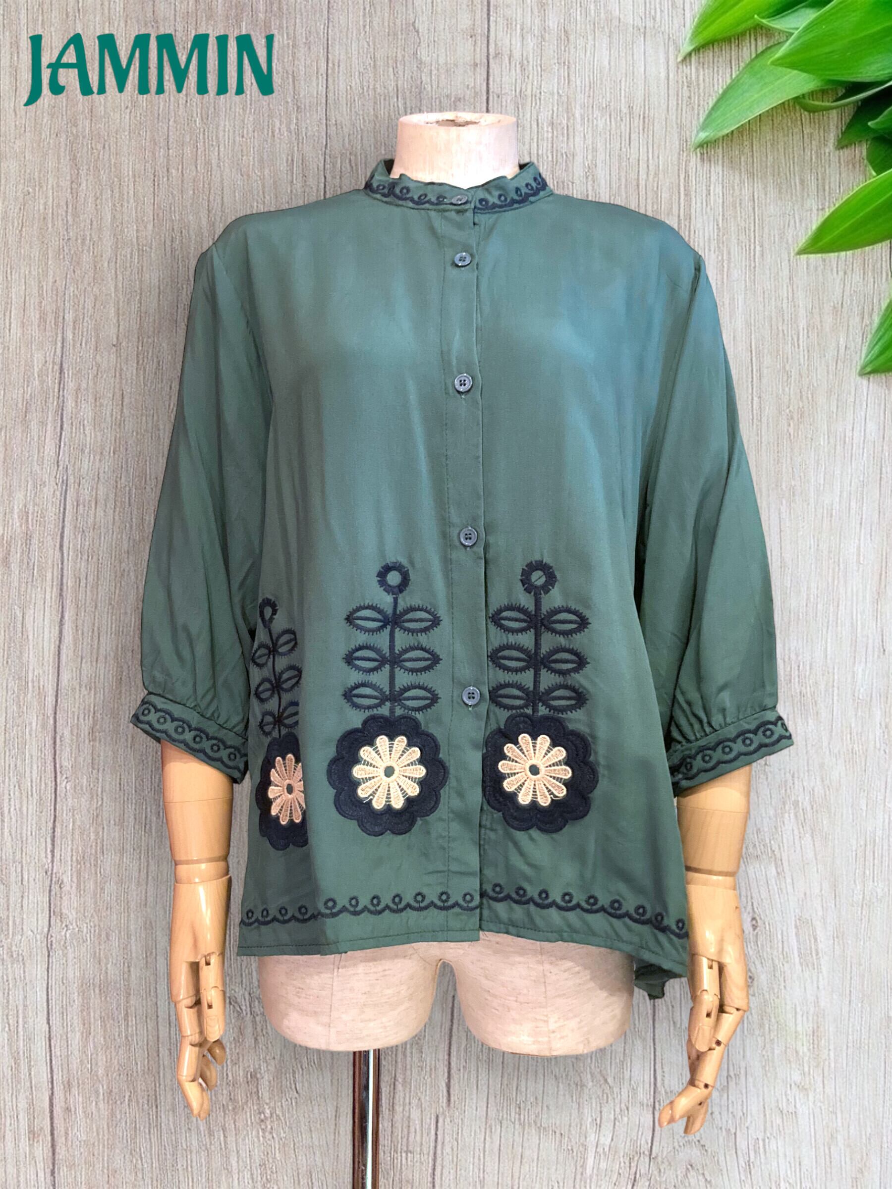 襟、袖口、裾にアジアンな刺繍入りブラウスです。