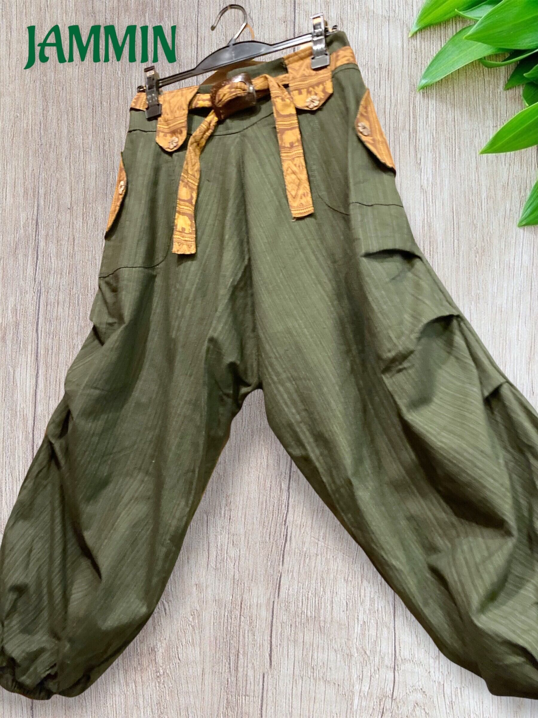前ウエストにアジアン柄のベルトループとココナッツバックル付きの飾り紐、左右のポケット口に飾りフラップ付き。