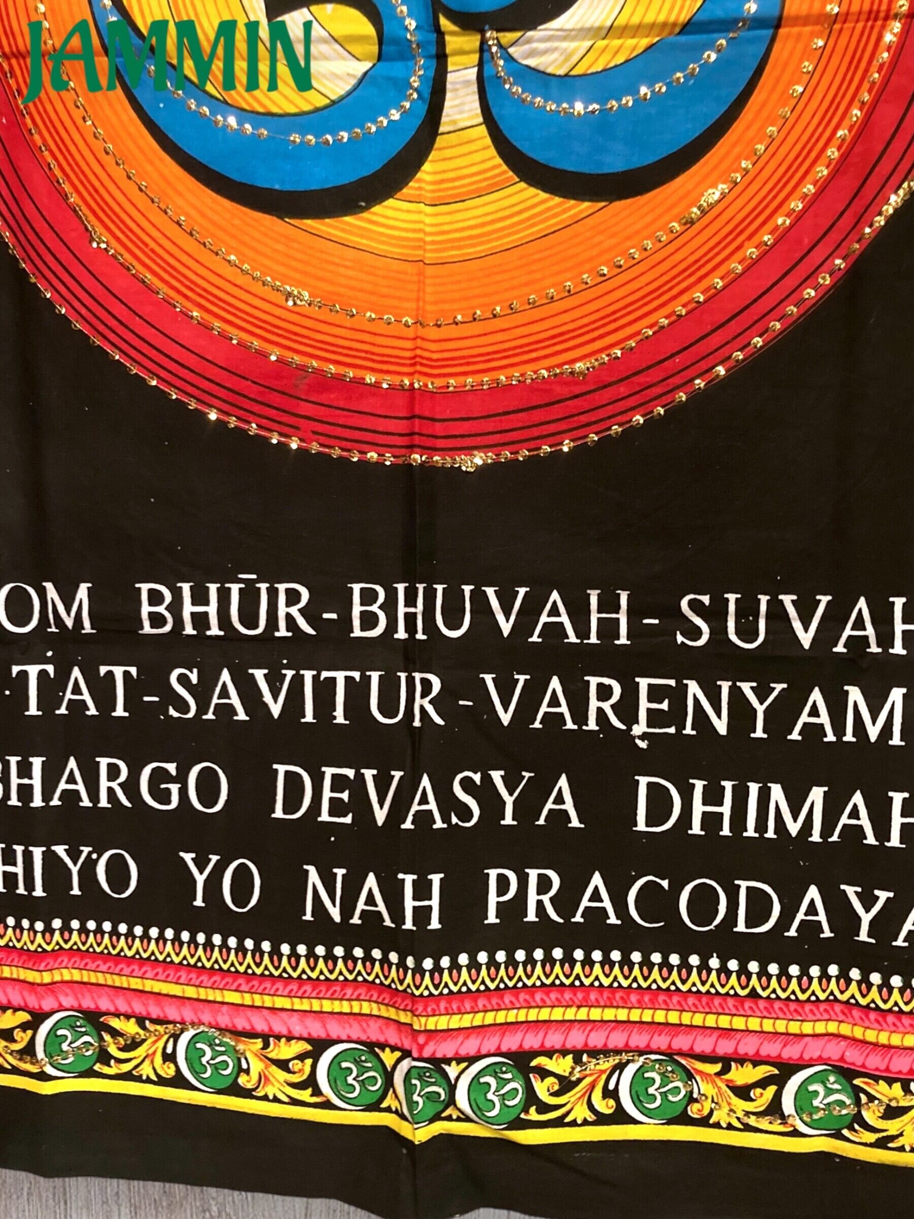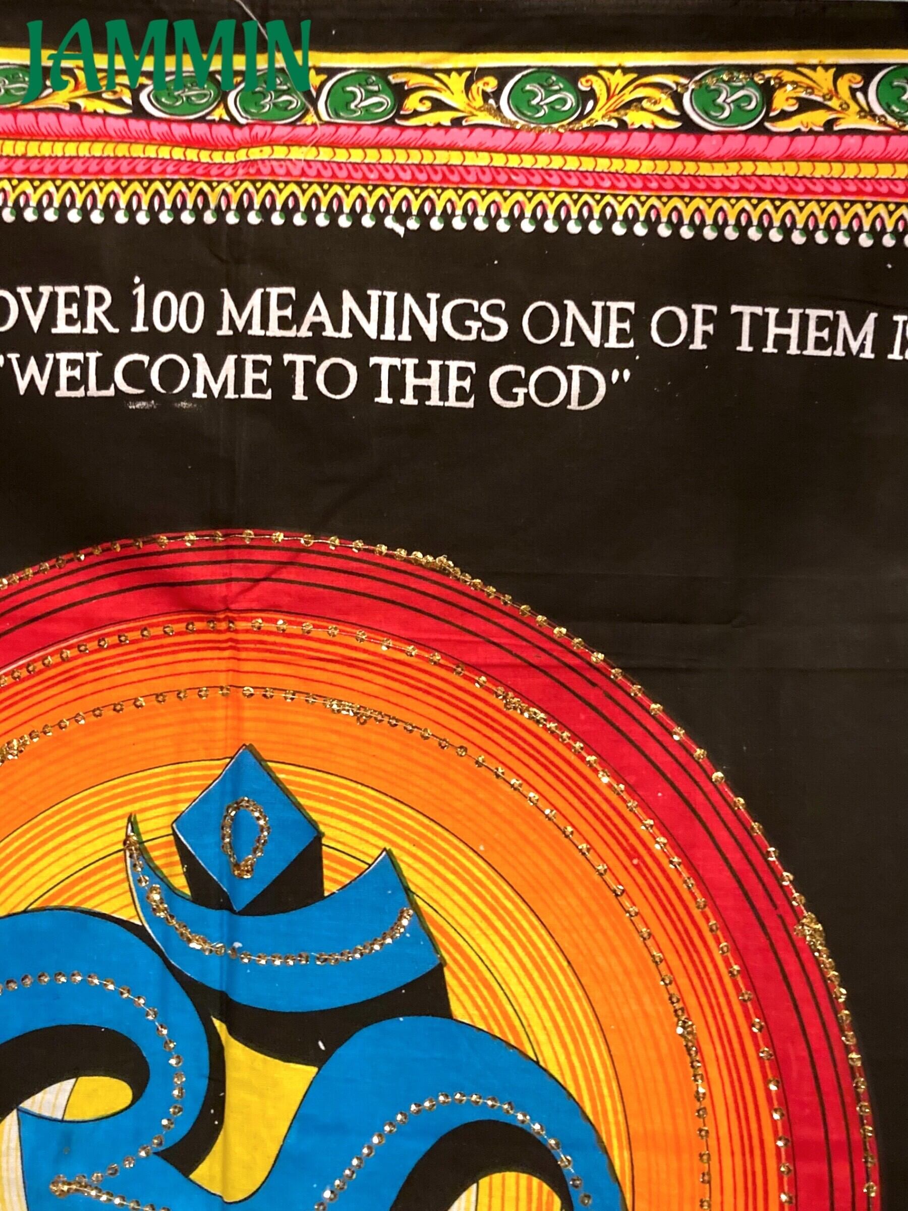 神の超越性、宇宙、音の起源などお守り的な意味のあるオームのカラフルなタペストリーです。