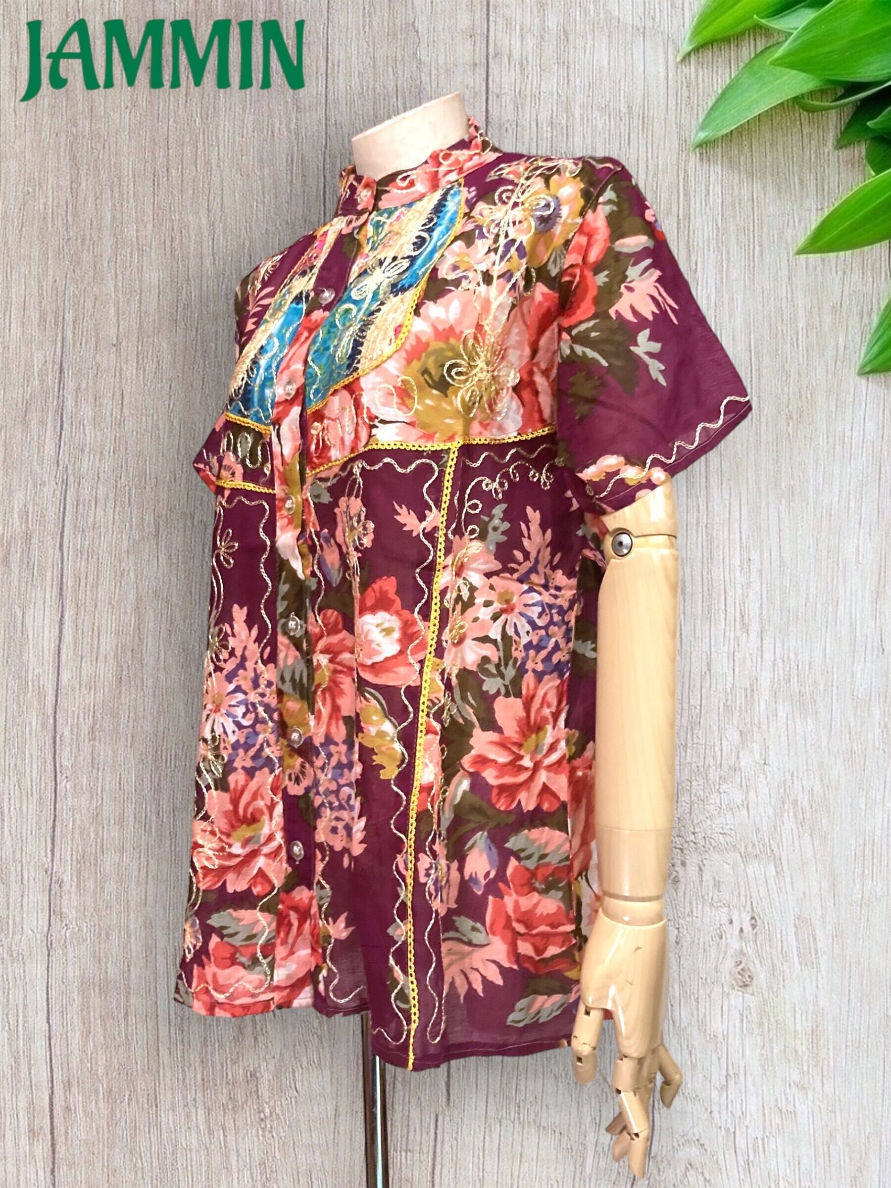 アジアンな植物刺繍入りの花柄半袖シャツです。