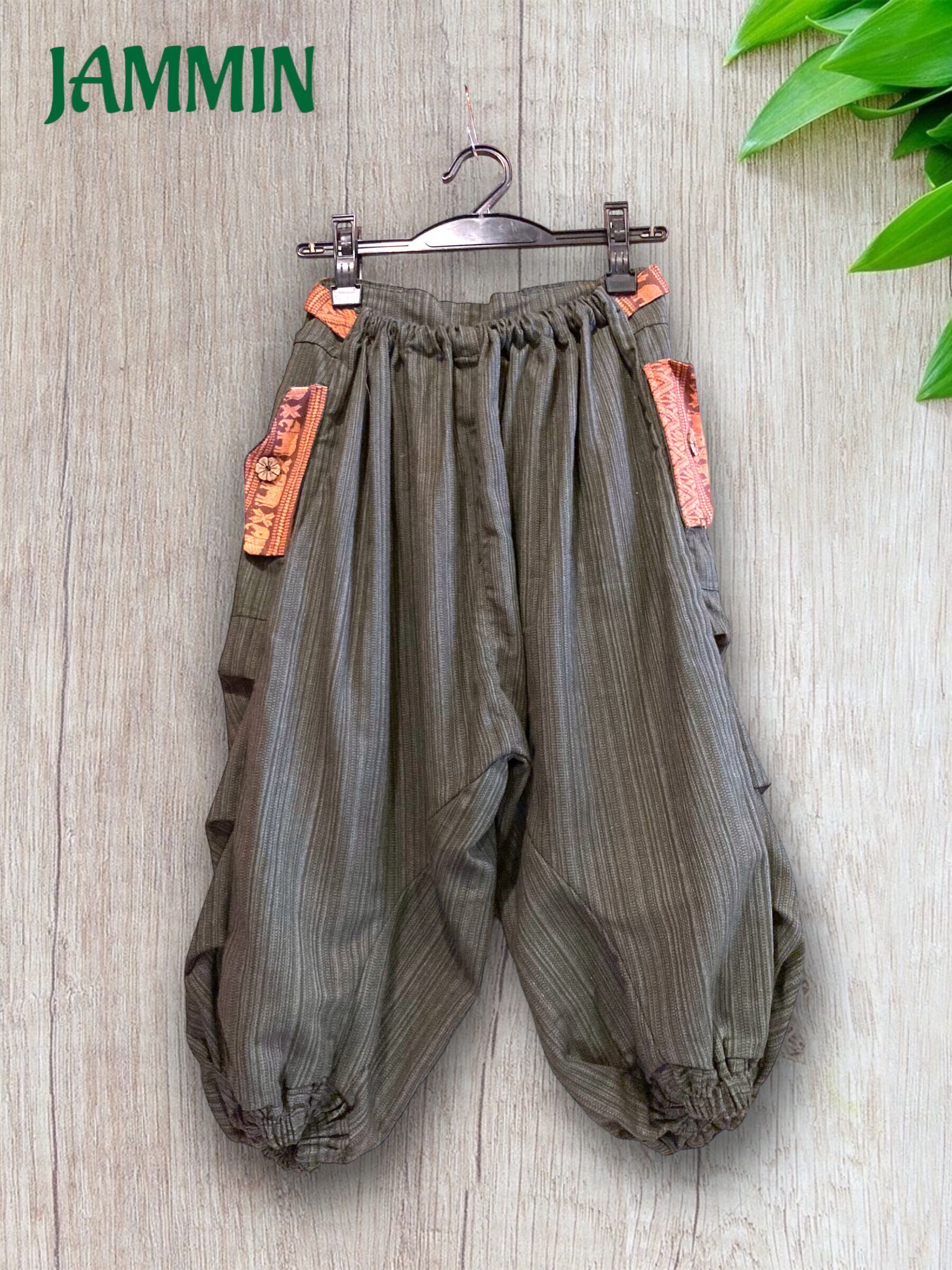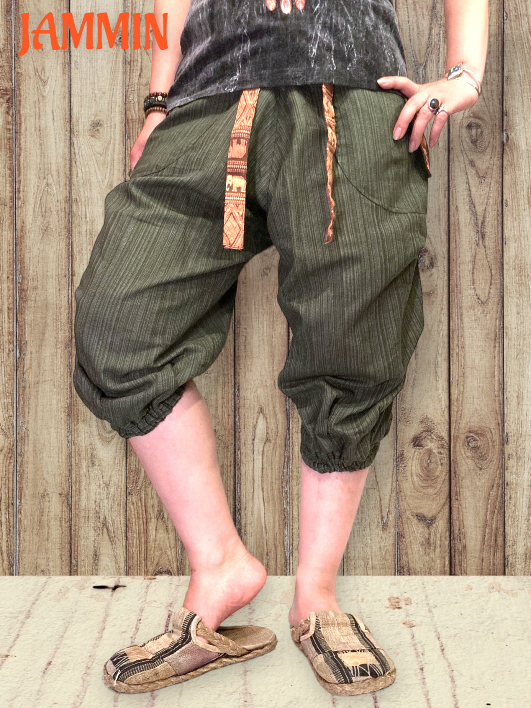 細かい織り柄のアジアンなショートサルエルパンツです。