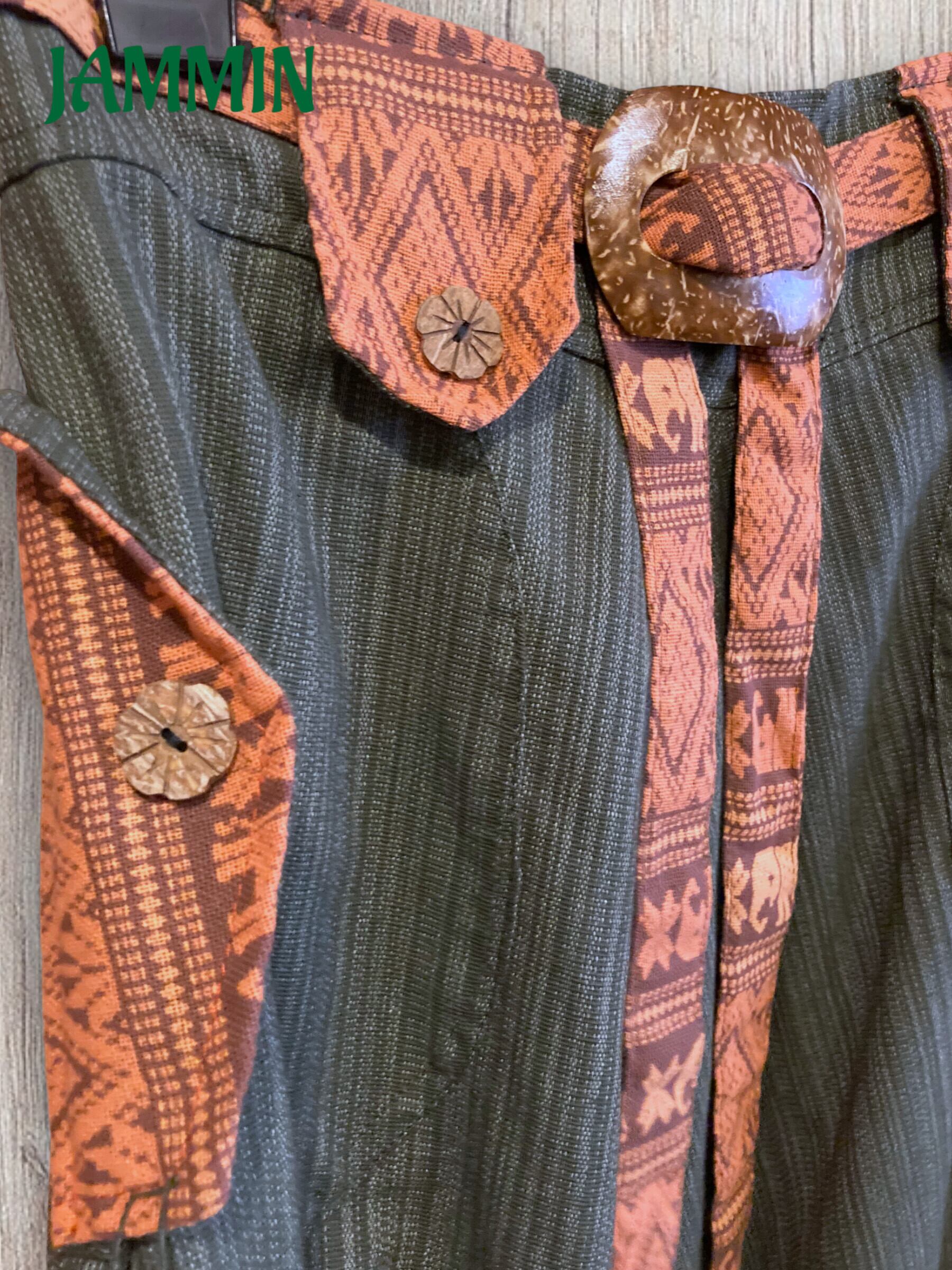 前ウエストにアジアン柄のベルトループとココナッツバックル付きの飾り紐、左右のポケット口に飾りフラップ付き。