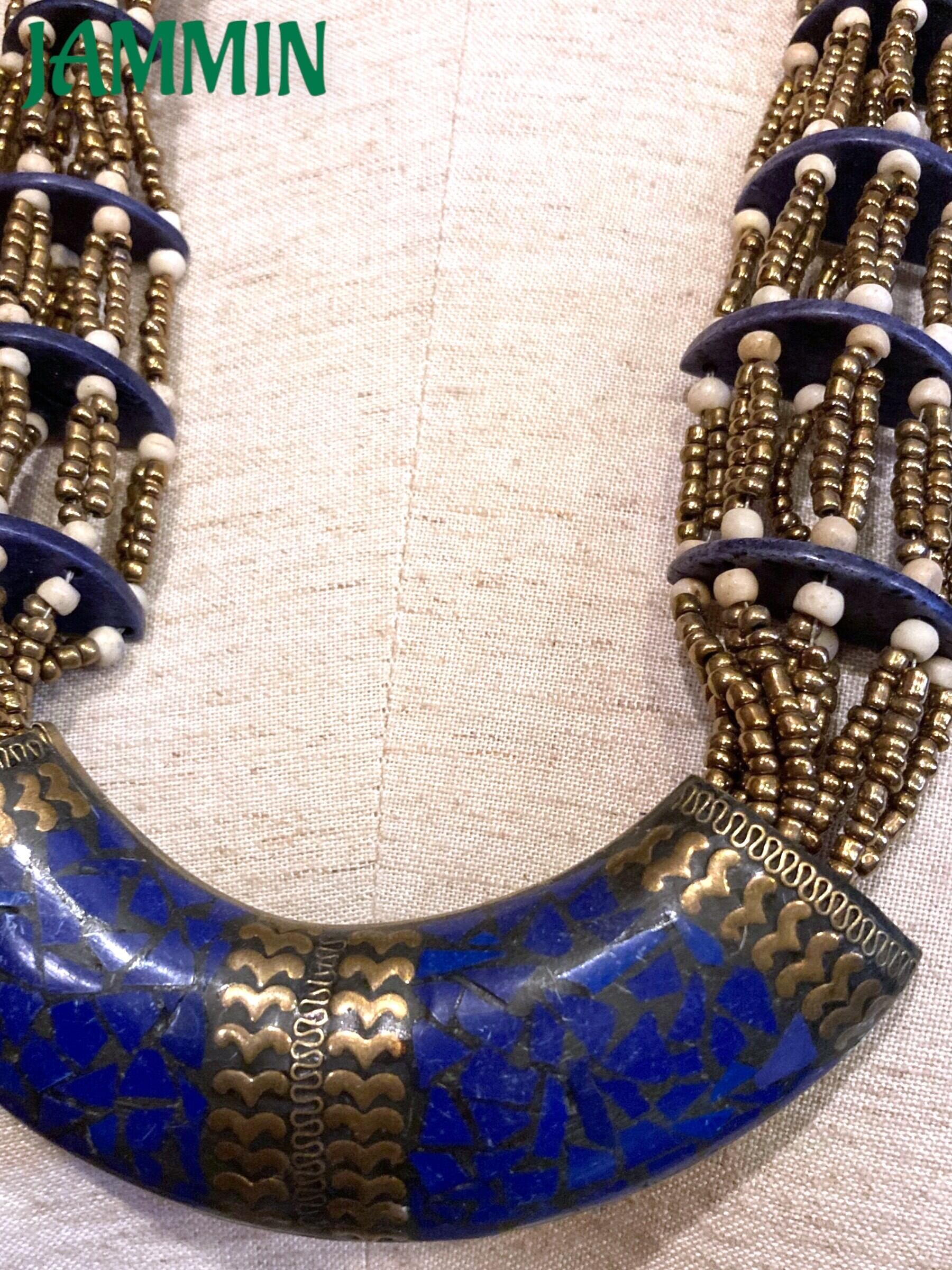 ラピスラズリを散りばめたブラスパーツを使った個性的なネックレスです。
